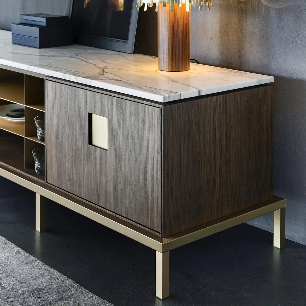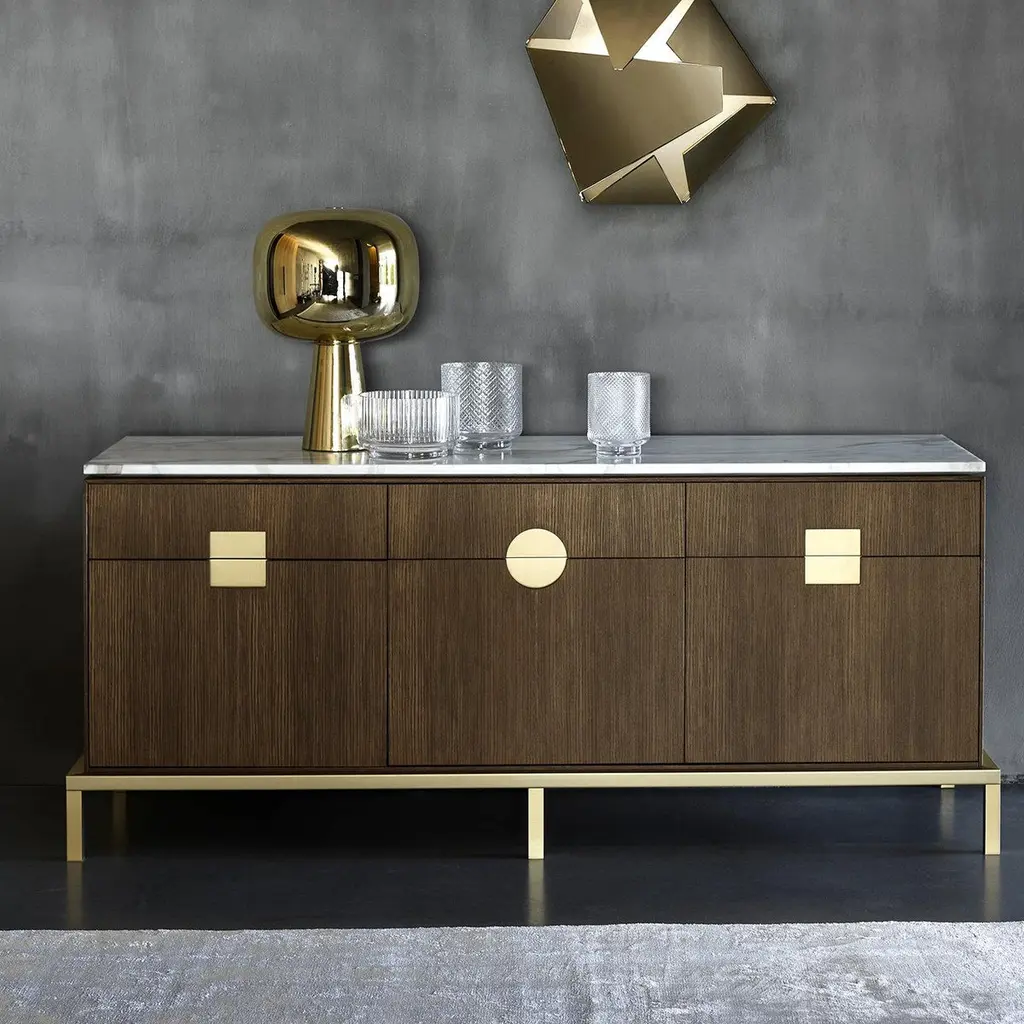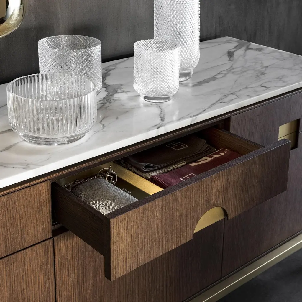 An exceptional combination of refined materials, this elegant cabinet showcases a clean and essential design of Japanese inspiration. Highly geometrical, it features an oak wood structure featuring three doors, enriched with two square handles on the side doors and a round one in the middle, all fashioned of brass. The base structure, composed of sleek and sturdy lines, is also fashioned of brass. To complete this design, a stately Calacatta gold marble top.
