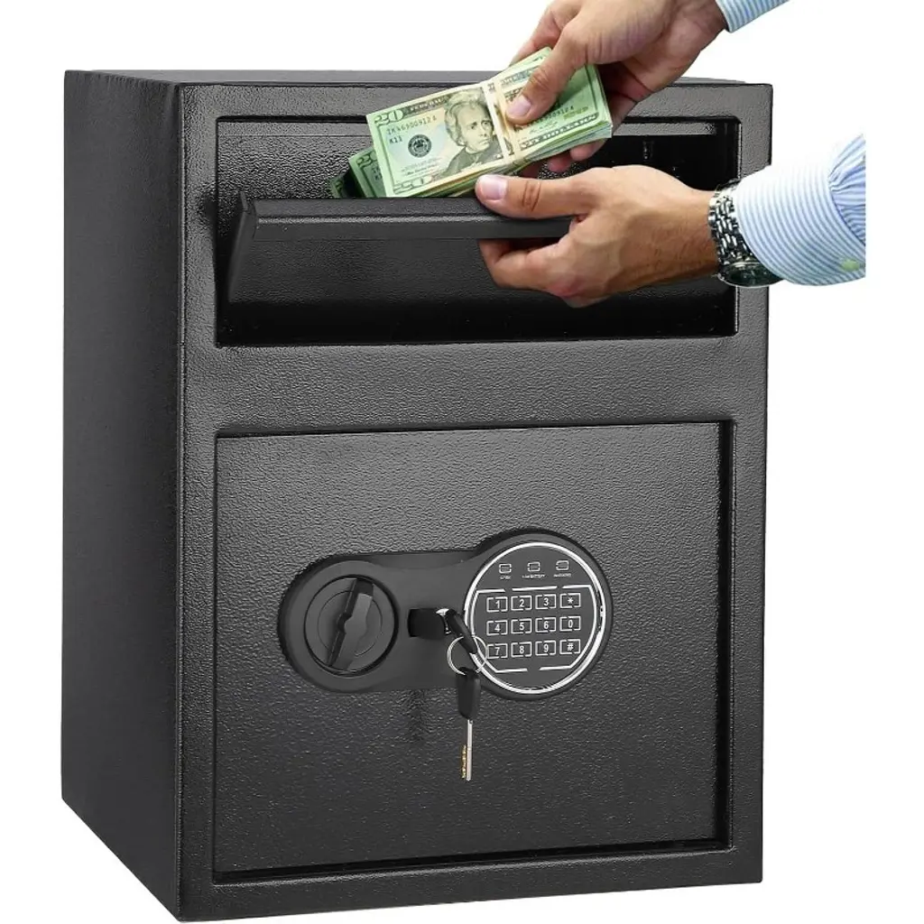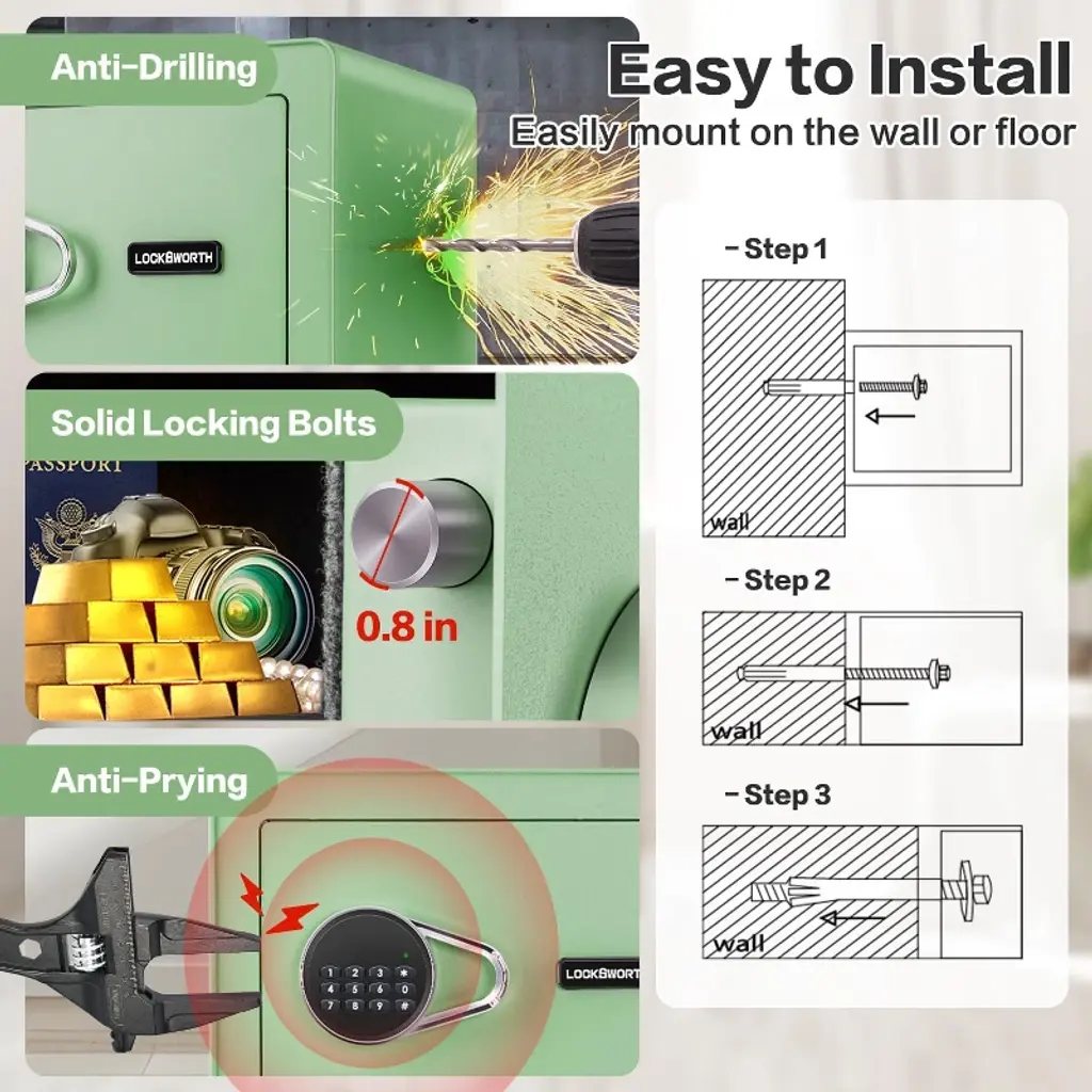 1.Tactical Design: The safe box showcases a sleek matte finish on its steel body and panels, providing superior camouflage to deter potential intruders or curious children. Unlike ordinary safes, the Locksworth cabinet safe boasts special bolt locking holders on the inner door for enhanced durability and an efficient anti-pry mechanism 2. Conveniently Sized: With a capacity of 0.6 cubic feet, this small safety deposit box offers secure storage for your cash, jewelry, documents, passports, and more. Its compact design makes it ideal for use in both residential and commercial settings 3. Flexible Partitioning: Experience the versatility of the digital small safe box with its removable shelf, allowing for easy organization of your valuables. The interior is lined with anti-moisture fabric, ensuring the utmost protection against scratches for items such as cashs and jewelry. The comprehensive kit includes a mounting kit for walls and closets, a manual 4. Advanced Locking Mechanism: Designed with a digital code lock, this security safe offers multiple options for access. You can unlock it directly using the code and knob. In the event of a forgotten password or dead battery, two emergency keys are provided 5. Effortless Setup and Warranty: The safe comes with pre-drilled mounting holes at the back, and the accessory bag includes expansion screws for easy installation