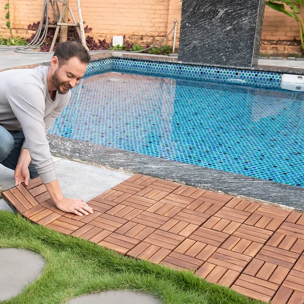 Gather your family for a DIY! Build and design your outdoor living space with our quick deck tiles. The all-natural wood look is attractive and will provide you with great decor for your outdoor space. Made of solid acacia wood and plastic base, durable and easy to maintain. The installation is so simple, that you can have your floor up in a few hours and enjoy it in no time. Use them to upgrade your outdoor space, such as balconies, gardens, patios, porches, and roof decks. They can even be a bold and creative attempt in the indoor bedroom living room!Specification:Tips: Notice: