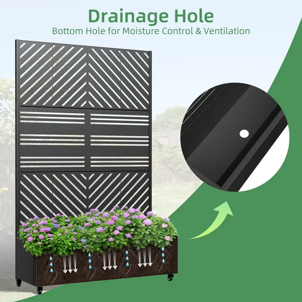 This stunning Black Wrought Iron Flower Shaped Outdoor Planting Box is a true garden centerpiece. Its elegant flower design, crafted from durable wrought iron, combines beauty with functionality. The integrated climbing frame supports climbing plants, vines, and flowers, allowing them to flourish gracefully. Standing at 71.37"x46.8"x15.6", this freestanding trellis planter serves as both a raised garden bed and a decorative element. Perfect for enhancing your outdoor space, it provides ample planting area while adding a touch of sophistication to your garden. Ideal for any green thumb looking to create a vibrant and eye-catching garden display.