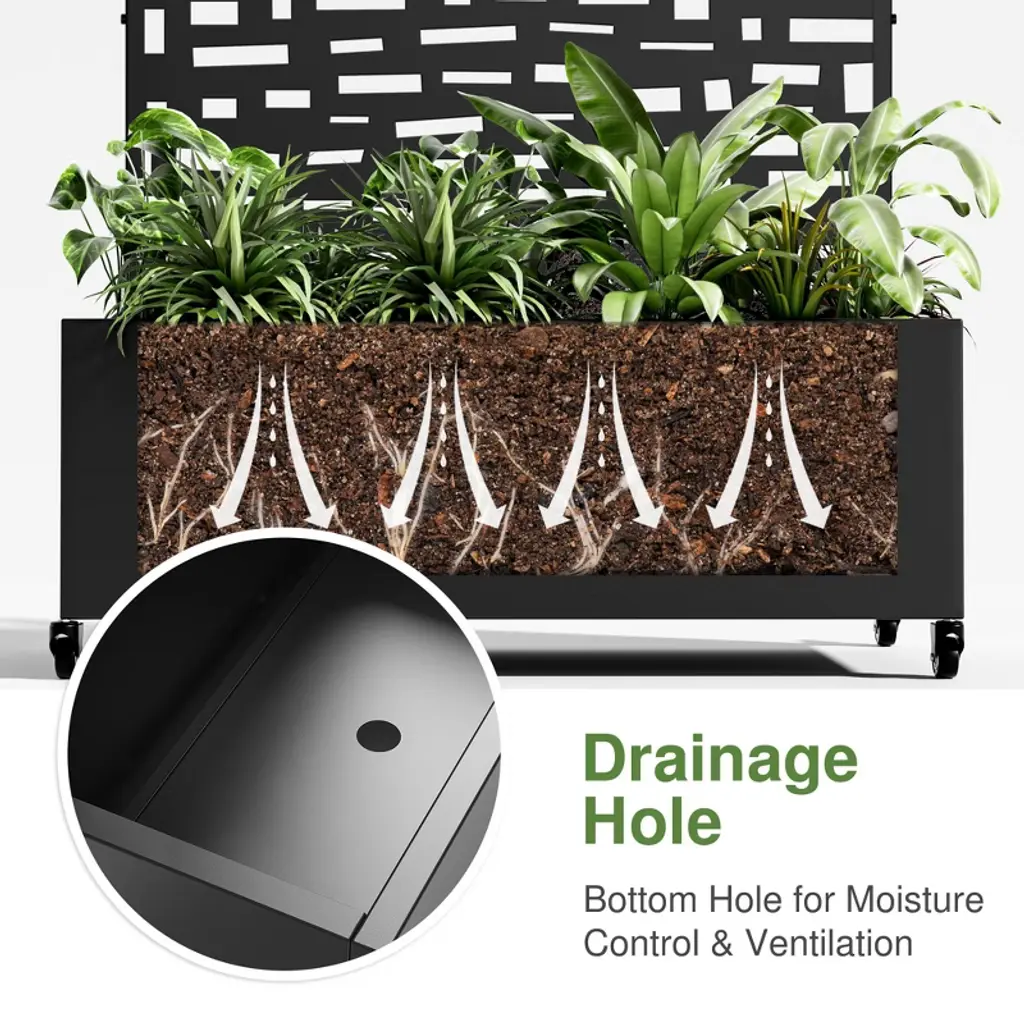 This elegant outdoor planting box boasts a distinctive wide edge, offering extra space for creative planting along its rim. Crafted from durable black wrought iron, it promises long-lasting strength against the elements. The integrated climbing frame is a standout feature, providing essential support for vibrant vines, climbing flowers, or trailing plants to gracefully ascend. Perfect for patios, balconies, or garden corners, this freestanding planter combines sturdy construction with stylish design, adding both functionality and visual interest to your outdoor space.