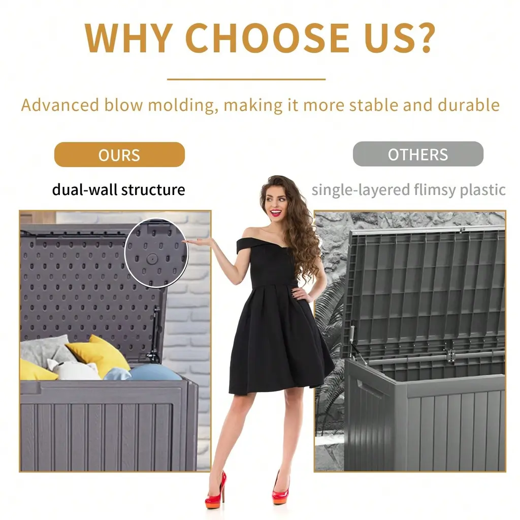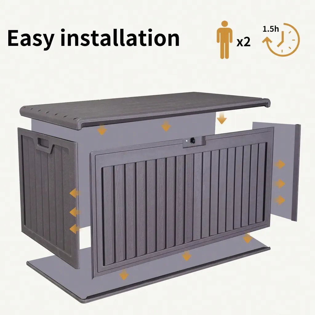 Dual-wall Resin Outdoor Deck Box: This 100-gallon resin outdoor deck box is crafted from weather-resistant materials, offering a sturdy double-wall structure. It withstands various weather conditions while maintaining its appearance, making it a perfect addition to any garden, backyard, or patio. Generous Storage Capacity: With dimensions of 50.39''L x 24.8''W x 25.2''H, this outdoor storage box provides ample space for storing patio furniture cushions, pool accessories, and garden tools. Its large 100-gal capacity makes it suitable for both indoor and outdoor use, keeping your space organized and clutter-free. Convenient User-Friendly Design: Our patio storage box features a hydraulic hinge for smooth, safe closing, along with an easy-lift system for effortless access to your items. Side handles allow for easy movement, and the lockable lid provides a secure place for your valuables, ensuring peace of mind. Versatile Use and Extra Seating: This deck box is more than just a storage solution—it also serves as a bench with a weight capacity of 500 lbs. Its versatile design makes it perfect for use as an extra seating option on your patio or as a side table in your garden, blending seamlessly with any outdoor setting. Simple Assembly Process: Assembly is quick and straightforward with the included instructions. Just align the panels and connect them using screws to have your resin outdoor deck box ready in no time. Enjoy the convenience of extra storage and seating with this easy-to-install solution for your patio and backyard.