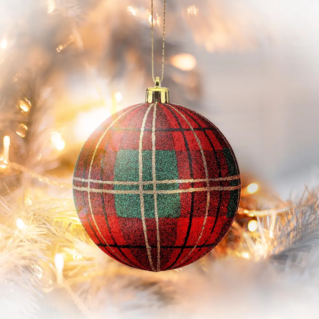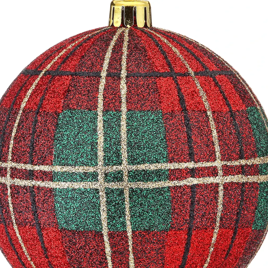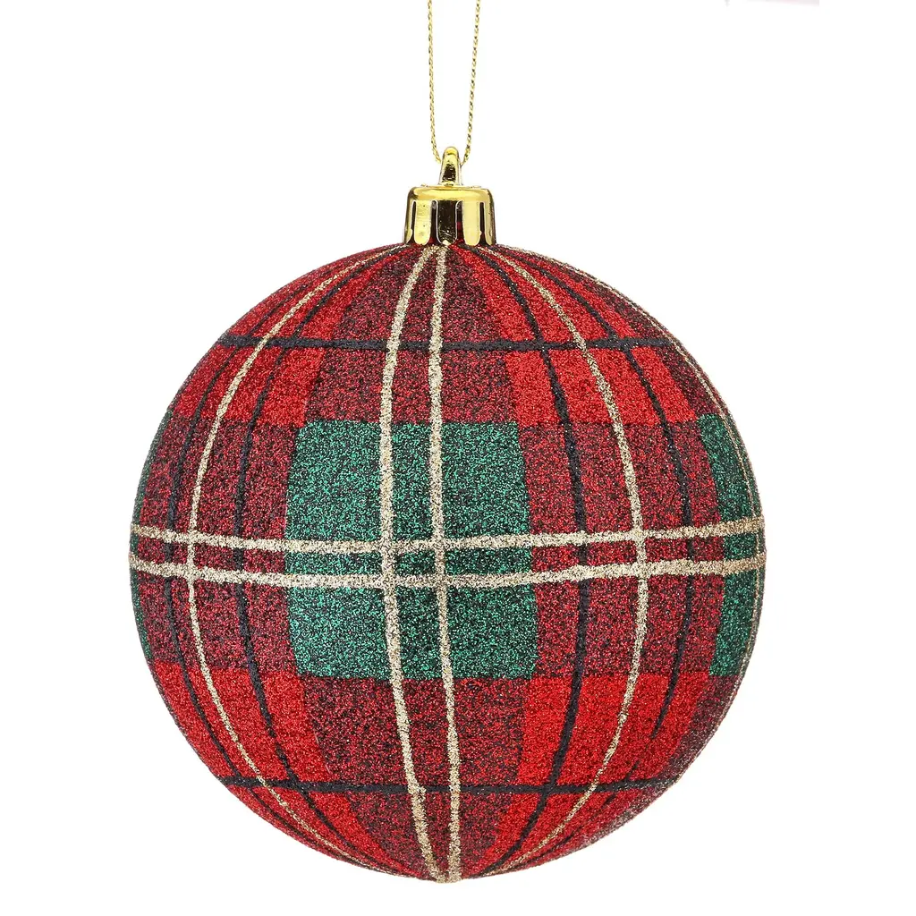 Set holiday traditions with these attractive 100mm Glitter plaid Ball Ornament in a gorgeous traditional red green and gold finish in a set of 3. Perfect for adding just the right touch of tradition and elegance to your Christmas this holiday season, crafted of plastic, filled with Styrofoam. Each ball measures 4" and includes a string for hanging. Perfect for hanging on your Christmas tree or giving as a gift. For cleaning simply wipe them down with a damp cloth.
