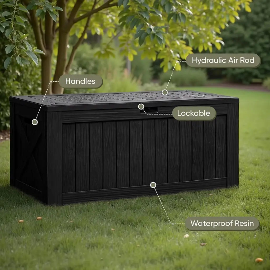 120 gallons (approximately 454 liters), suitable for storing small to medium-sized outdoor items such as patio furniture cushions, gardening tools, pool accessories, or courier packages. The internal space layout is reasonable and can flexibly store scattered items. The resin material itself has waterproof properties, and the sealed structure of the box cover can resist rainwater intrusion, making it suitable for storing moisture sensitive items.