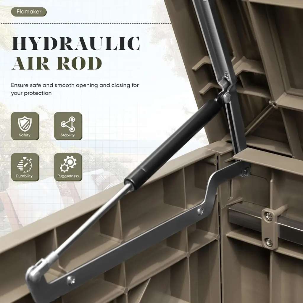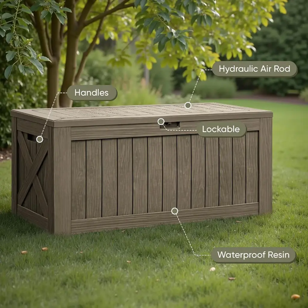 120 gallons (approximately 454 liters), suitable for storing small to medium-sized outdoor items such as patio furniture cushions, gardening tools, pool accessories, or courier packages. The internal space layout is reasonable and can flexibly store scattered items. The resin material itself has waterproof properties, and the sealed structure of the box cover can resist rainwater intrusion, making it suitable for storing moisture sensitive items.