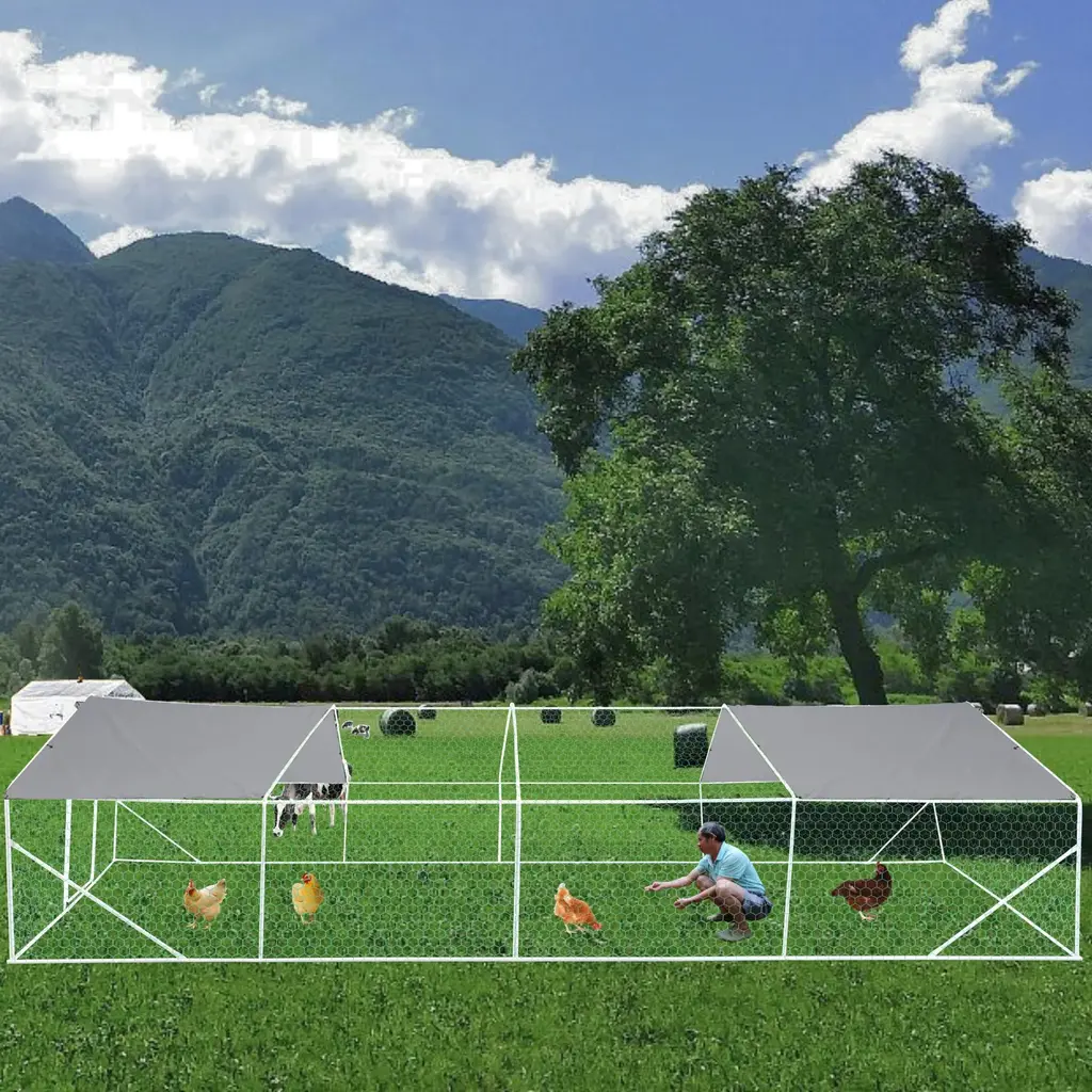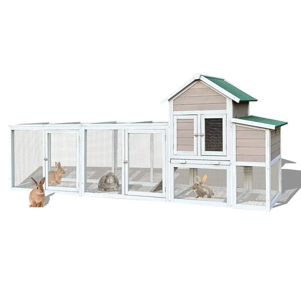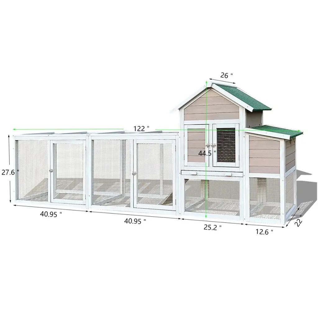 Durable Construction: This large pets house is made of solid fir wood with paint. It features a waterproof roof made of anti-UV material for enhanced weather protection.With a Sliding Door:The Sliding door separates the rest area and paly area and keeps your pets safe at night.Easy Access : Your pet is easily accessible via a ramp,the pet can come and go as they please throughout the day.Easy to Clean:A built-in slide-out tray to collect droppings and waste. Strong Lock:The nesting box has a strong lock to prevent your pet from other wolf .Large Space: Include large nesting box,resting area with a ramp to running area,provides a ample space for your chickens,duck and other small animals to rest and play.OVERALL DIMENSION: 122" L x 26" W x 44.5" H.