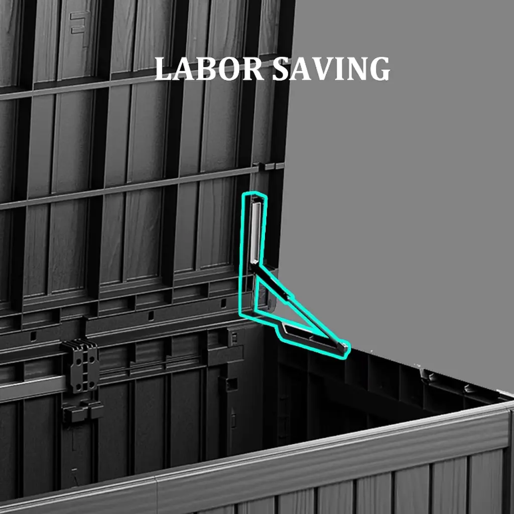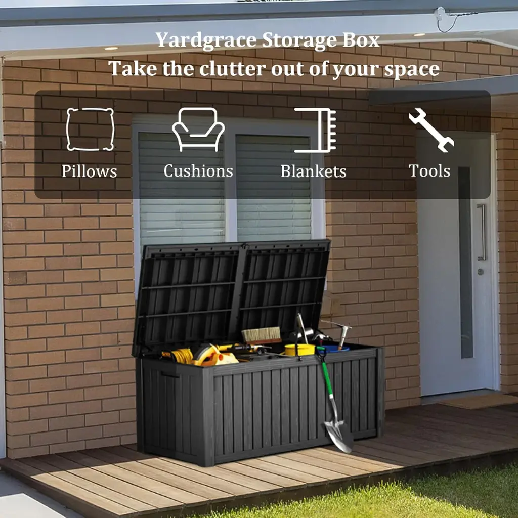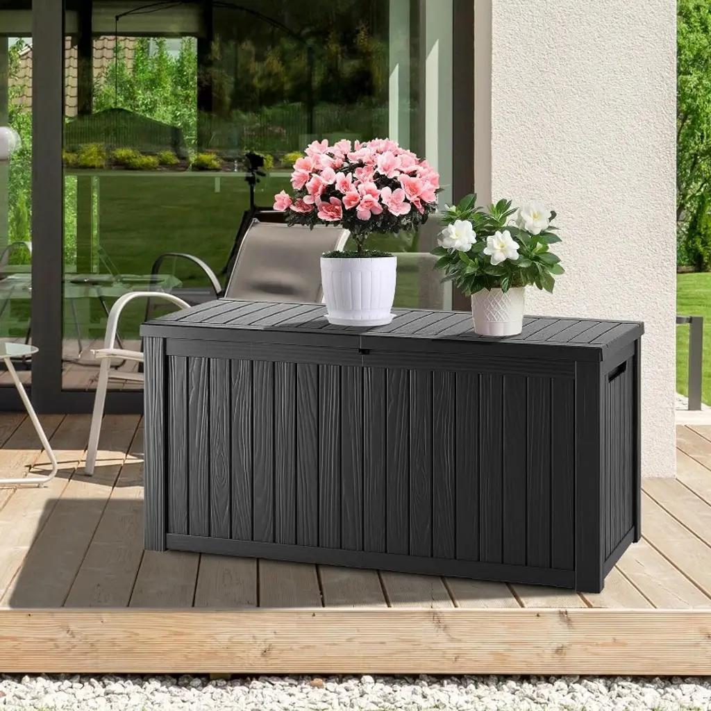 This deck container has a capacity of 180 gallons (approximately 681 liters) and is a super large capacity solution for outdoor storage. It can store large gardening tools, pool equipment, camping gear, outdoor furniture cushions, and more. Its design balances practicality and space utilization, making it suitable for scenarios such as courtyards, terraces, or decks. The box is Black colored and the surface is treated with a wood grain like texture, suitable for modern or industrial outdoor environments.