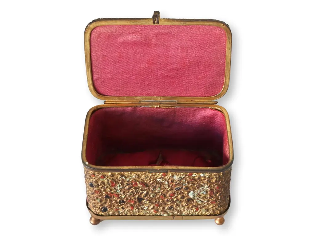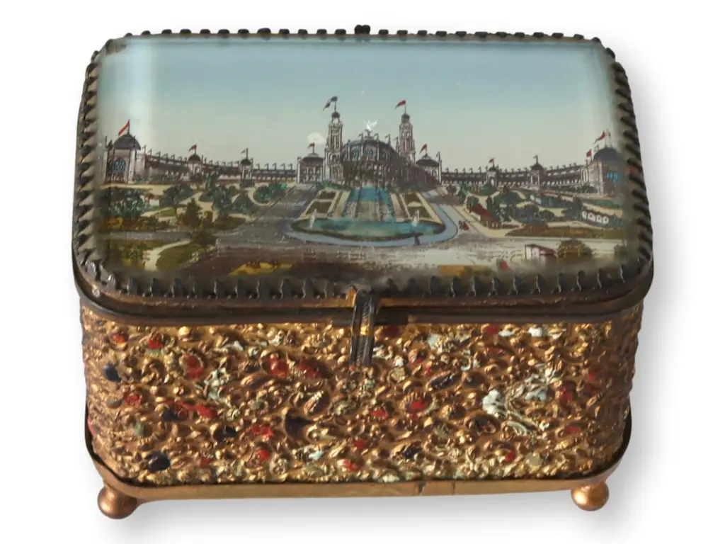 Own a piece of history with this French ormolu ring or trinket box, commemorating the Paris Exposition of 1878. This exquisite box is a testament to the era's grandeur and France's rich cultural heritage. Crafted with meticulous attention to detail, it reflects the artistic and architectural marvels showcased at the exposition. Gilt and enamel box, beveled glass reverse printed scene of Exposition in 1878. Silk interior remains in good condition.
