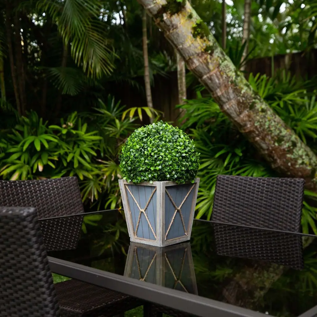 Brighten any space with our Artificial Boxwood Topiary Ball, a verdant year-round delight. This UV-resistant piece is illuminated by 20 energy-efficient LED lights, (battery operated, 3 x AA batteries not included), adding a cozy twinkle to your favorite nook, indoors or out. Created by expert horticulturists using top-tier materials, it's a burst of everlasting greenery that won’t fade away wherever displayed. Feel free to simply unbox, fluff and place in the space of your choice. At a versatile 18 inches from a decorative planter and safe for outdoor use, it's the ideal green companion to light up your home or garden with an elegant, maintenance-free touch. Let this boxwood beauty be the evergreen heart of your decor, day in and day out.
