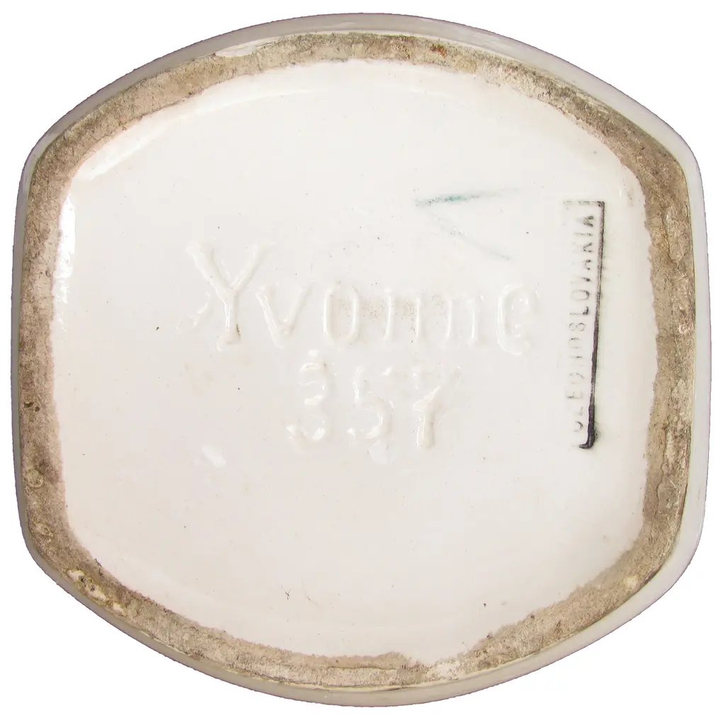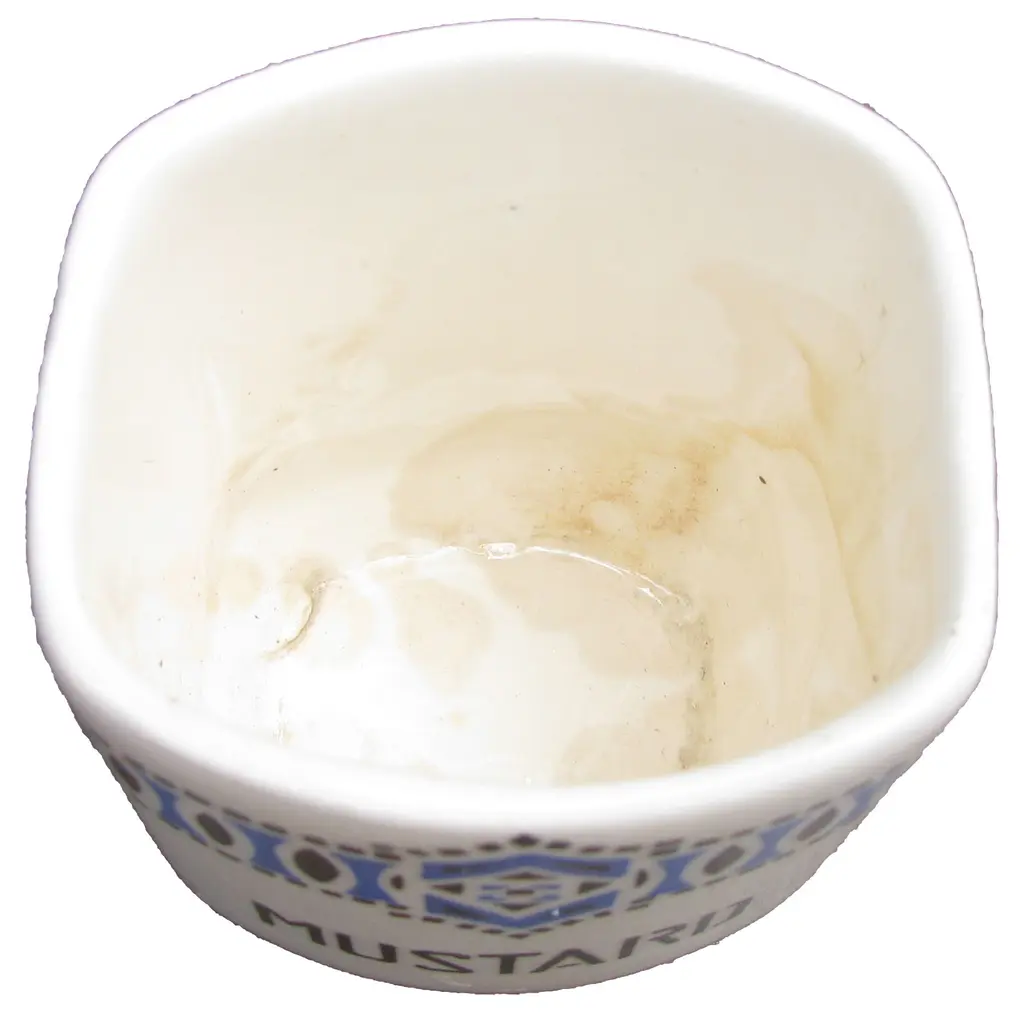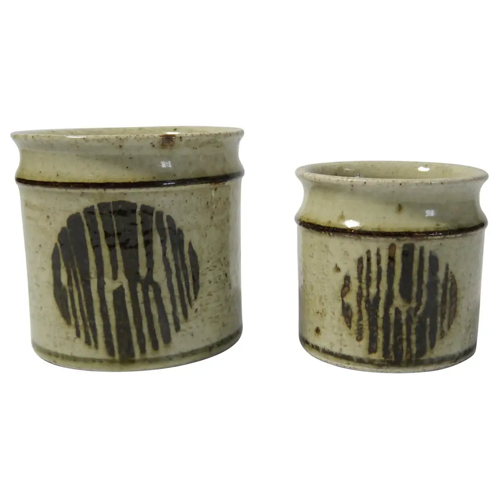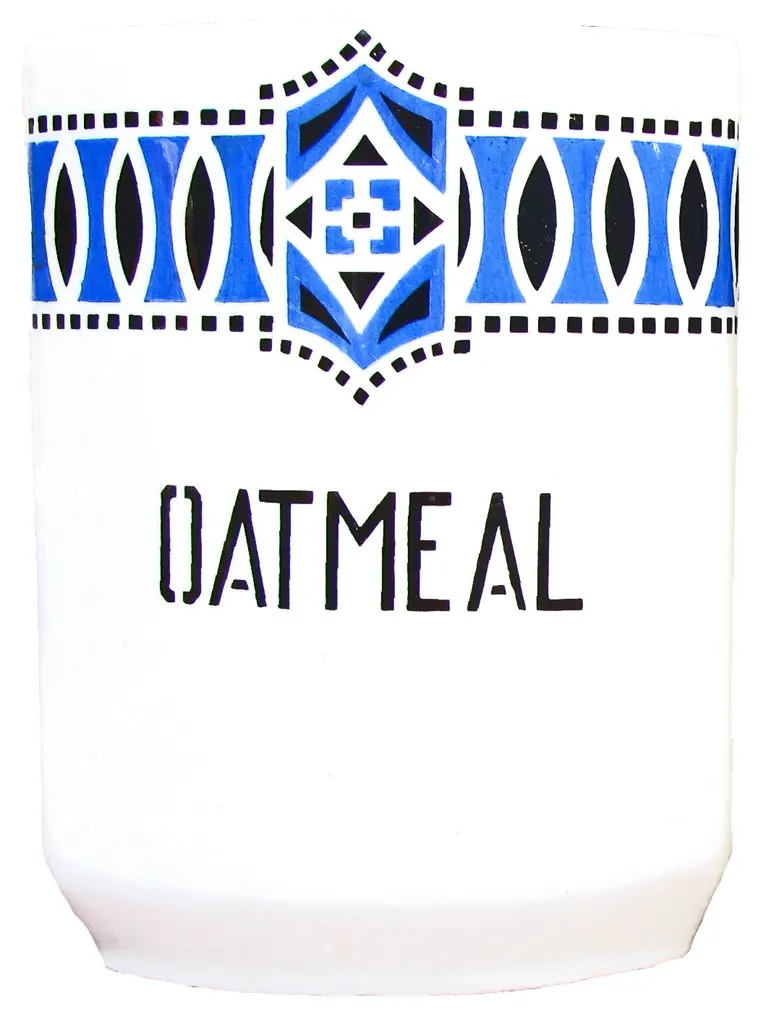 Jazzy collection of 1920s/1930s Art Deco ironstone canisters & spice jars with fabulous graphic appeal in cream, blue, and black,. Two large (4.6" x 4.25" x 6.25") "Oatmeal" & "Rice" two s;mall (2.5" x 2.2" x 3.25") "Allspice" and "Mustard". Fun vessels to hold kitchen utensils, herb plants, floral bouquets, or to display for their strong design aesthetic. Marks: "Czechoslovakia", "Yvonne 357". Large jars have stable hairline rim cracks, Mustard has interior stains. None detract from display.
