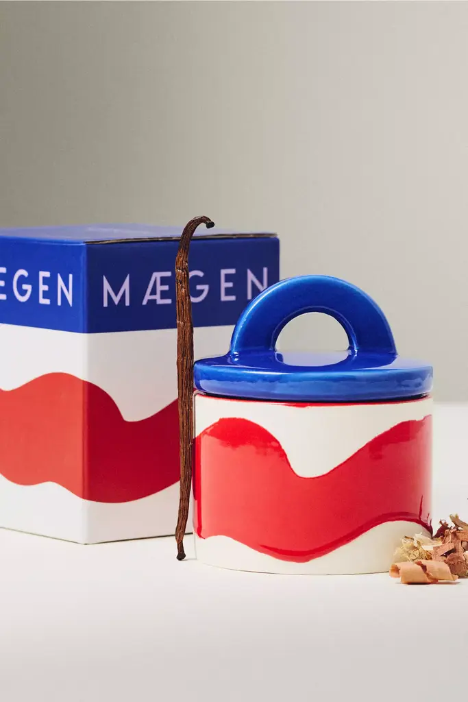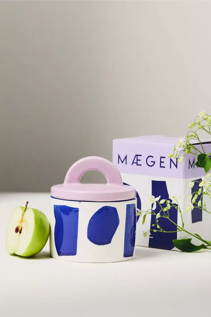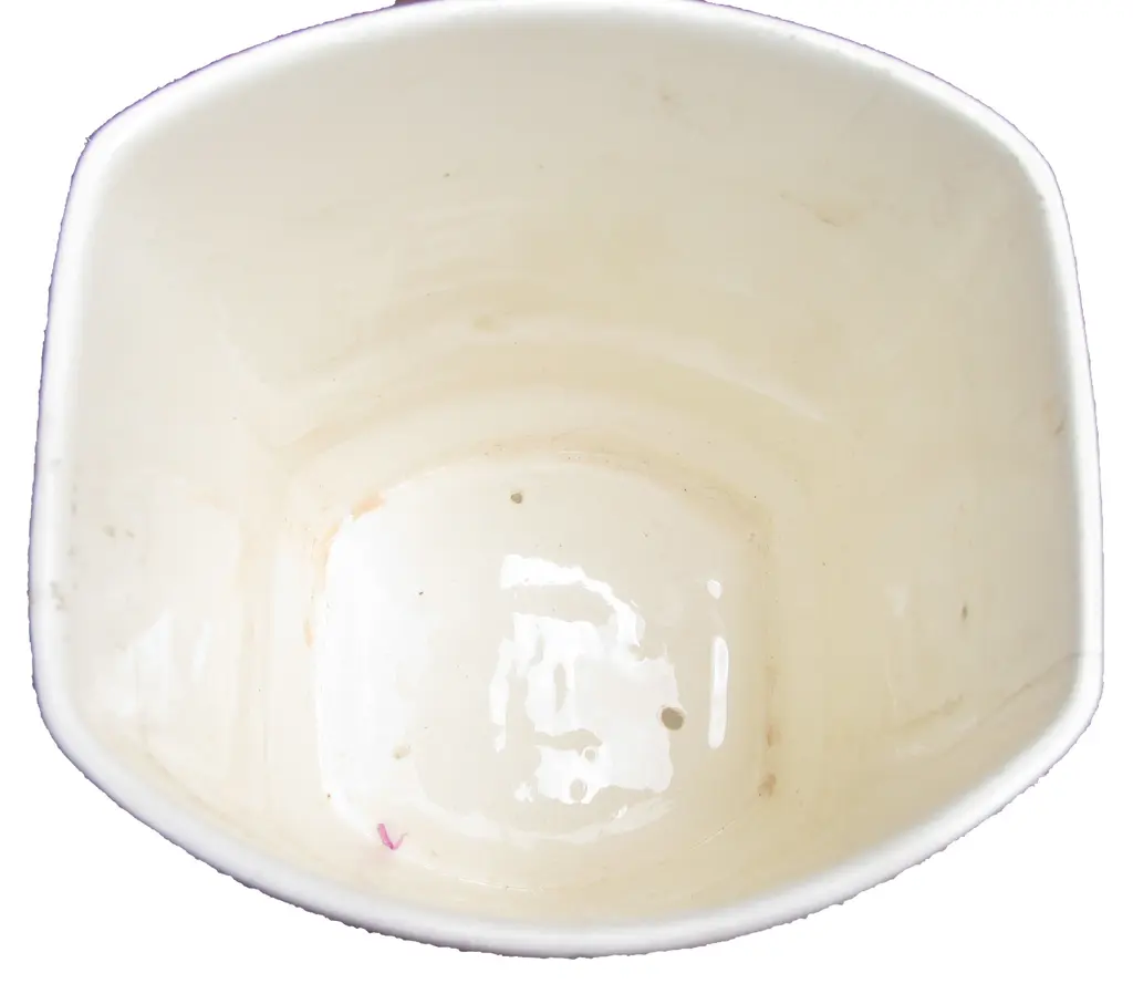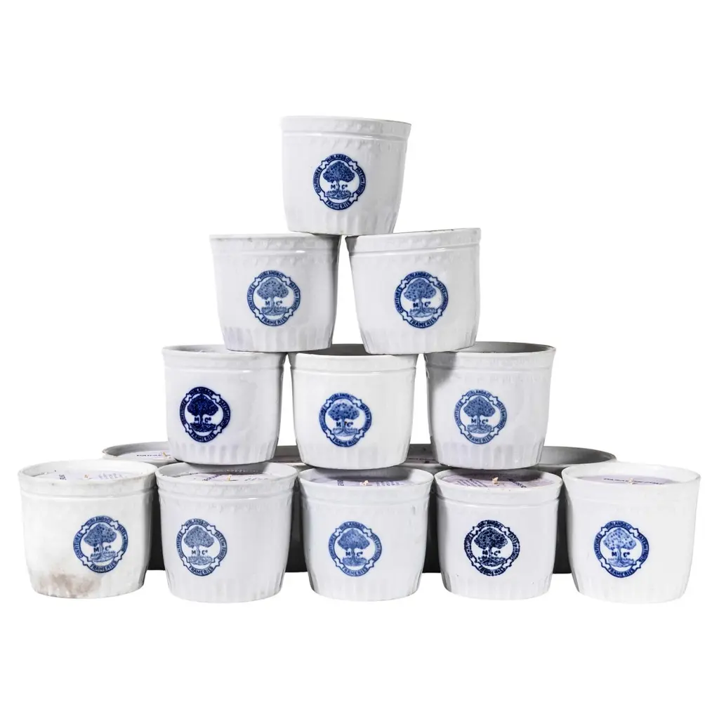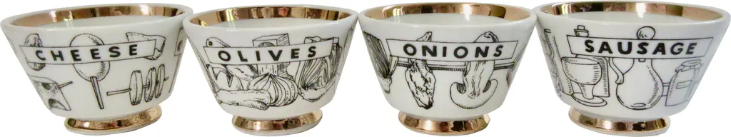 Jazzy collection of 1920s/1930s Art Deco ironstone canisters & spice jars with fabulous graphic appeal in cream, blue, and black,. Two large (4.6" x 4.25" x 6.25") "Oatmeal" & "Rice" two s;mall (2.5" x 2.2" x 3.25") "Allspice" and "Mustard". Fun vessels to hold kitchen utensils, herb plants, floral bouquets, or to display for their strong design aesthetic. Marks: "Czechoslovakia", "Yvonne 357". Large jars have stable hairline rim cracks, Mustard has interior stains. None detract from display.