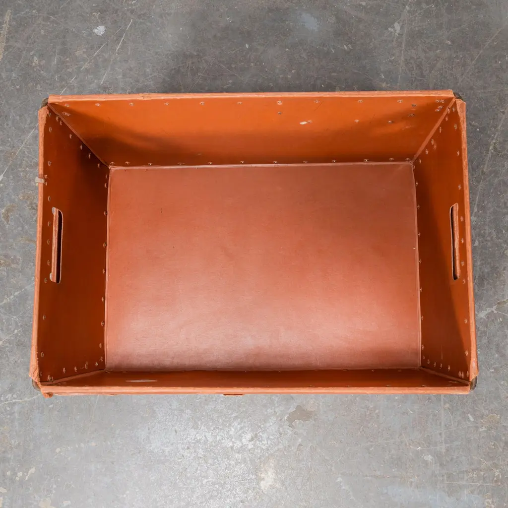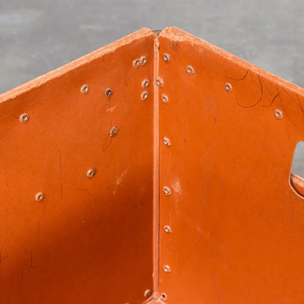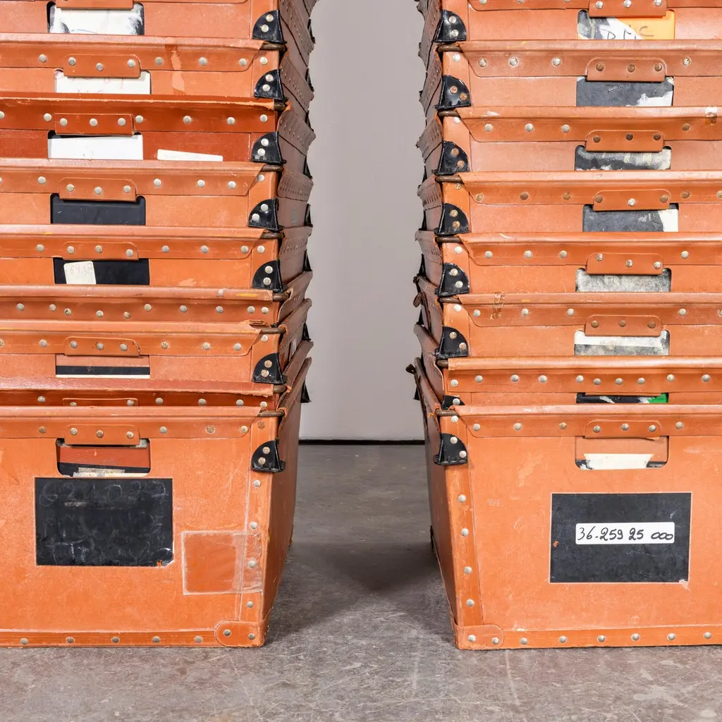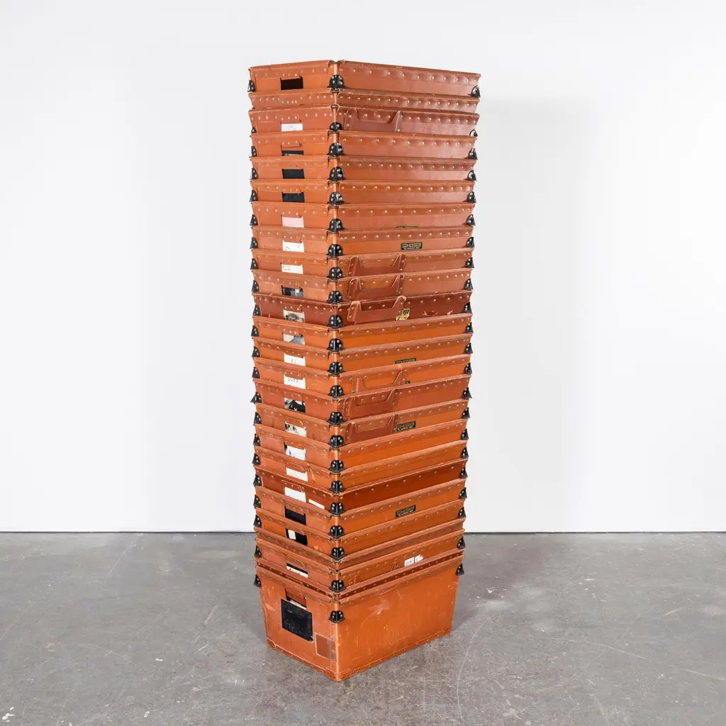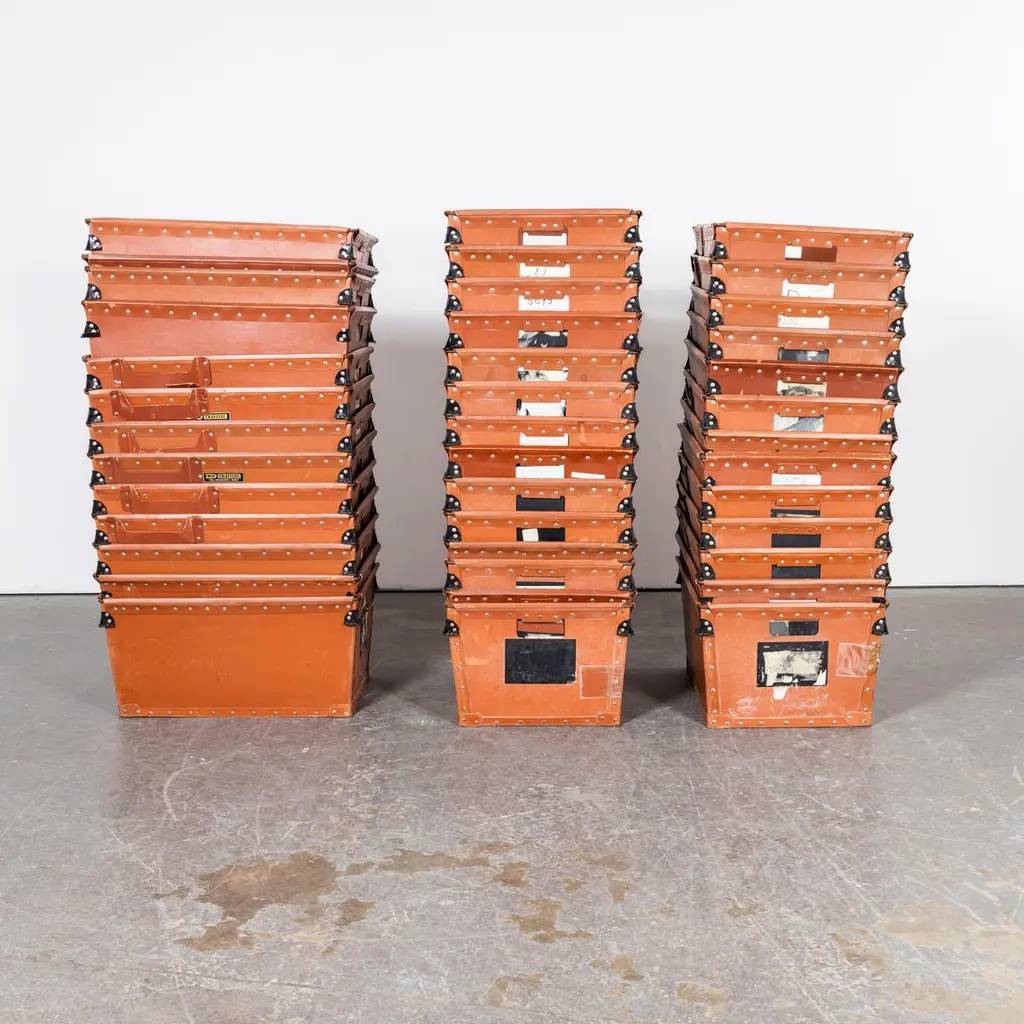 1960's Trafitol Vulcanised Card Storage Boxes - Large Quantity Available. In 1853 the textile industrial revolution arrived in Loos, Nord France with the formation of the Esquermes factory by Alfred Thirez. The factories produced cotton thread for sewing and embroidery. This boom in the textile industry produced a need for practical industrial storage solutions and Trafitol from Gent, Suroy and others sprung to life to meet this new industrial market. The boom for practical hard wearing dry, robust containers that could store the textile raw materials, spawned the invention of vulcanised fibreboard, a tough rigid and practical card that was boiled and formed, typically in the iconic dusty red colourway.Workshop Report:Our workshop team inspect every product and carry out any needed repairs to ensure that everything leaves us serviced and maintained ready for many more years of life. All of our vintage products show the rich beauty and history of their life with the knocks and bumps of many years of use and we try to minimise restoration to keep every piece as original as possible.Date: 1960'sMaker: Industrial Production – BelgiumDimensions: 28cm(w) x 58cm(l) x 40cm(h)