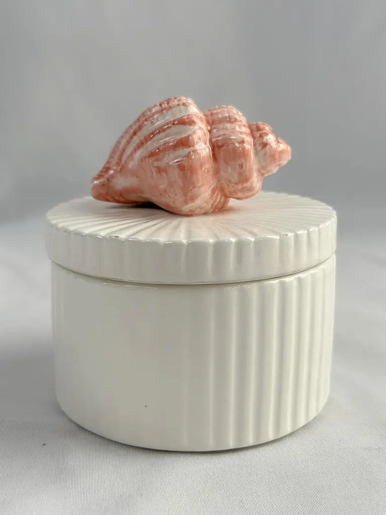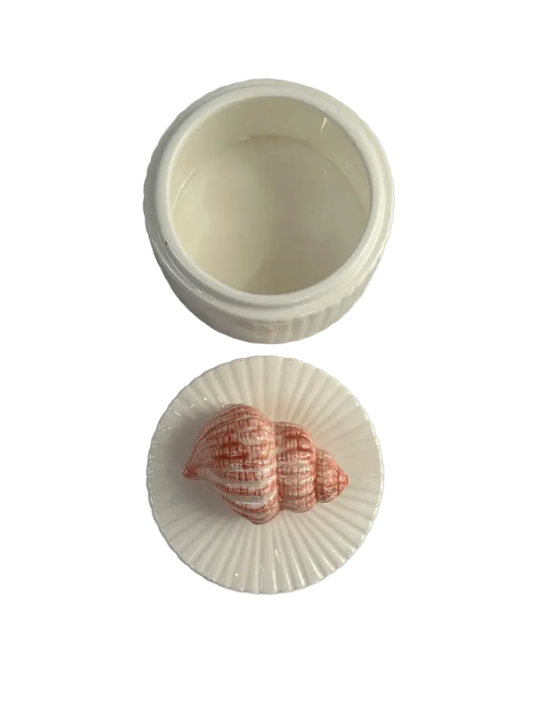 This is a charming Fitz and Floyd off white rounded sea shell ceramic box. The box is a scalloped design with a coral colored large finial sea shell on top. This is in very good vintage condition. 3.5 inches by 3.5 inches.
