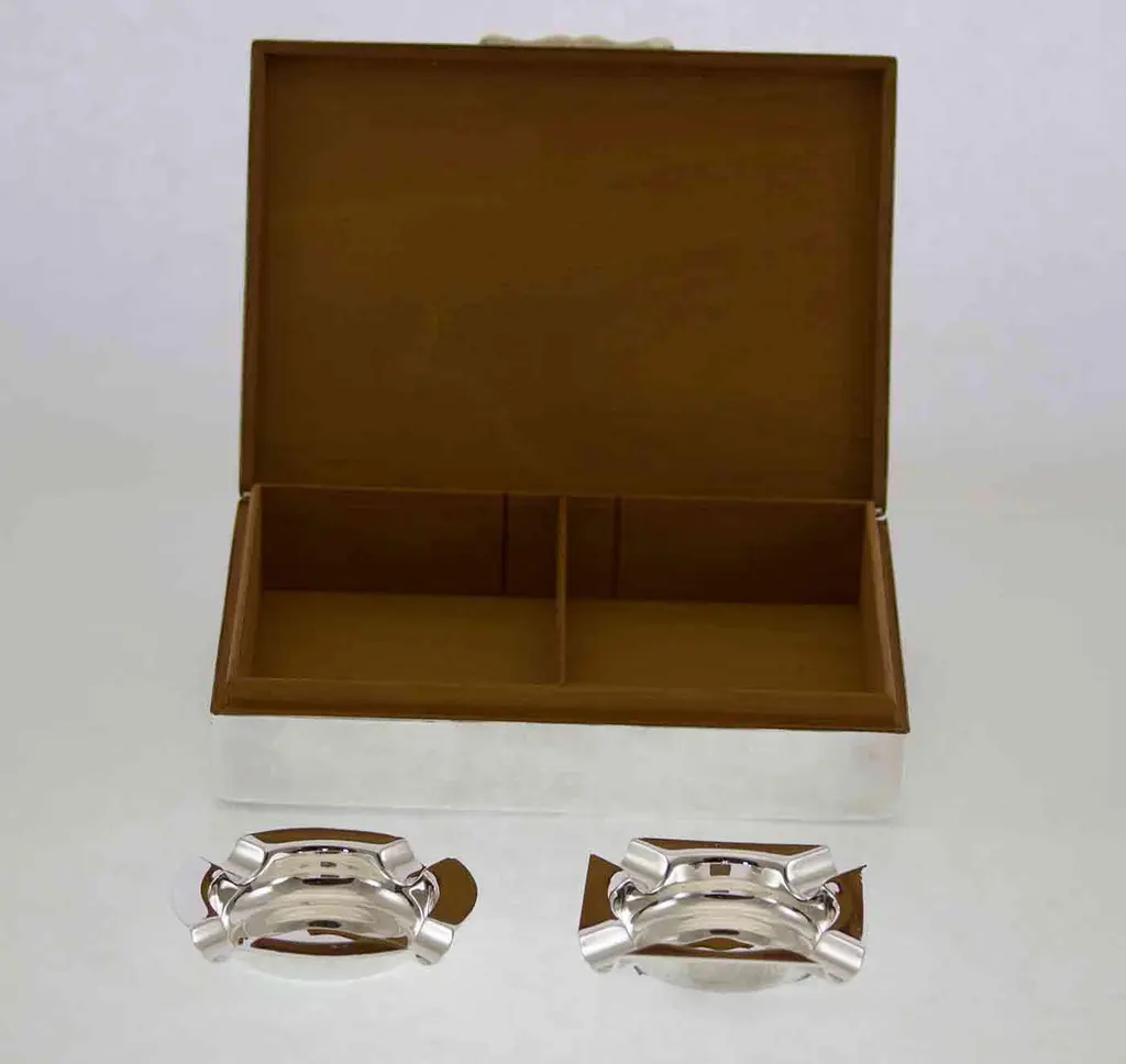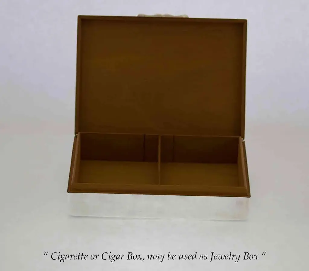 Description: Silver Wood Lined Cigarette Box, Plain. Pattern : Plain Size : 7 in. A Silver Cigarette Box Plain Wood Lined , May be used as Small Cigar Box or a Jewelry Box. Electro Plated on E.P.N.S. , a quality silver plated on Nickel Silver Made in England, by Hartman Bros Marked : Hartman Bros Retail Price : $ 290.00 Wholesale : $ 150.00 N.B. Hartman Bros, a distinguished silver company in Sheffield , England; supplier of finest stores in the U.K such as, Mappin & Webb, Garrard's etc... and abroad. Condition : New - Factory Original Packaging. P.S. This Cigarette Box may be converted into a Jewelry Box.