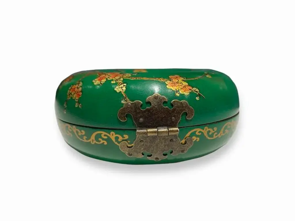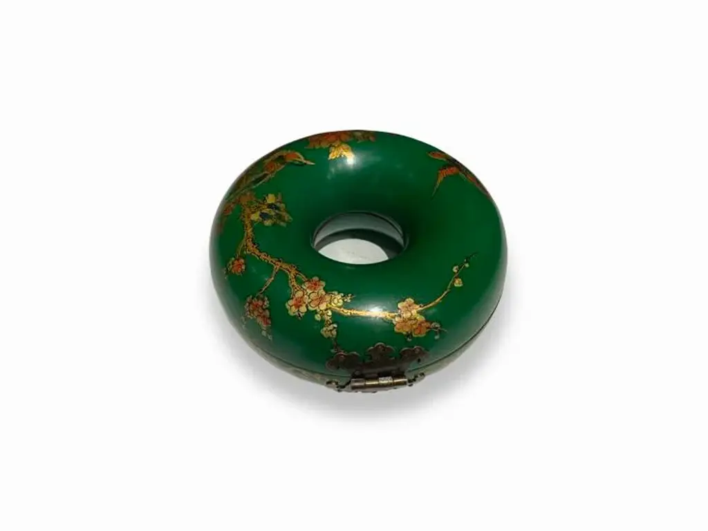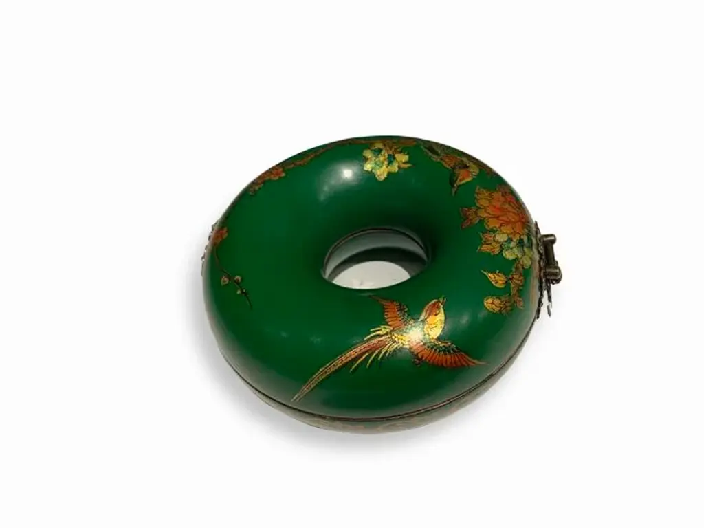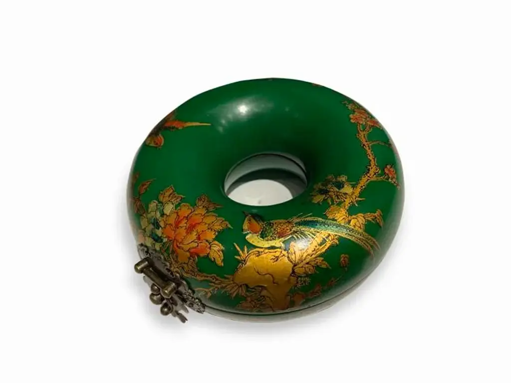 Delicate and beautiful green donut jewelry box with bird and flower designs. Great for necklaces and bracelets. No maker marked.
