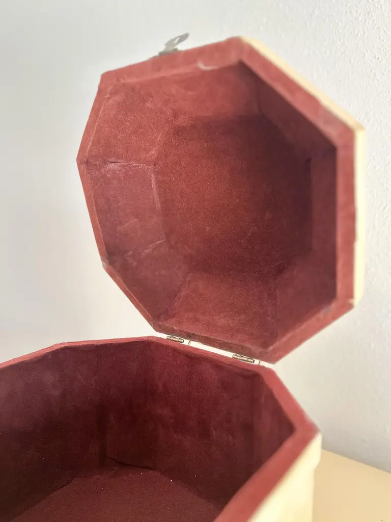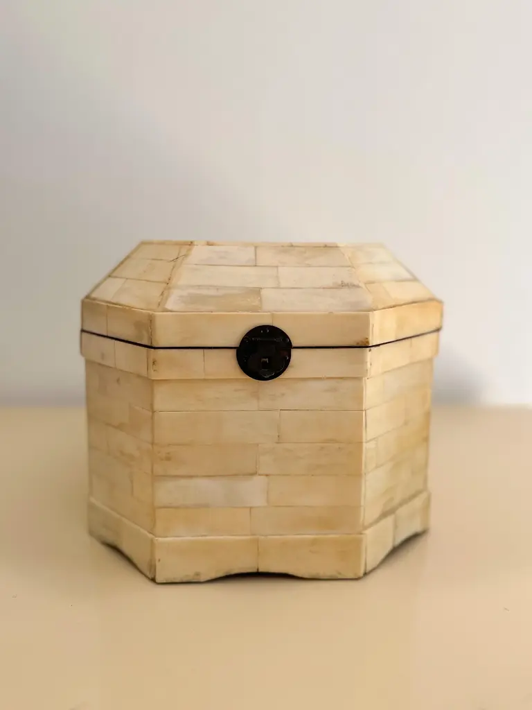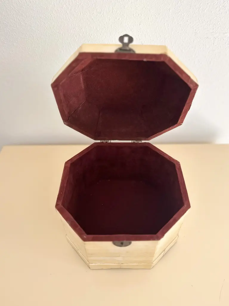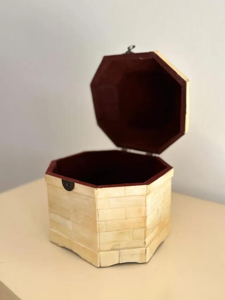Vintage octagonal boxes made of ivory bone in a brick pattern, with maroon velvet lining and a brass clasp securing the hinged lid. These substantial boxes can fit loads of treasures. Two boxes are available and sold separately, each displaying light wear and discoloration as expected for their age.