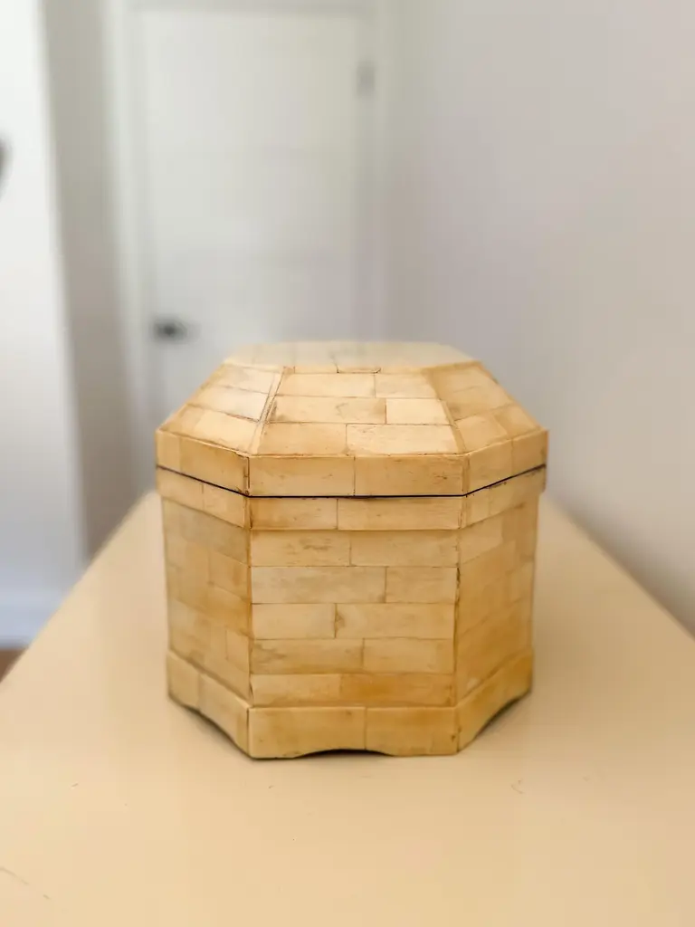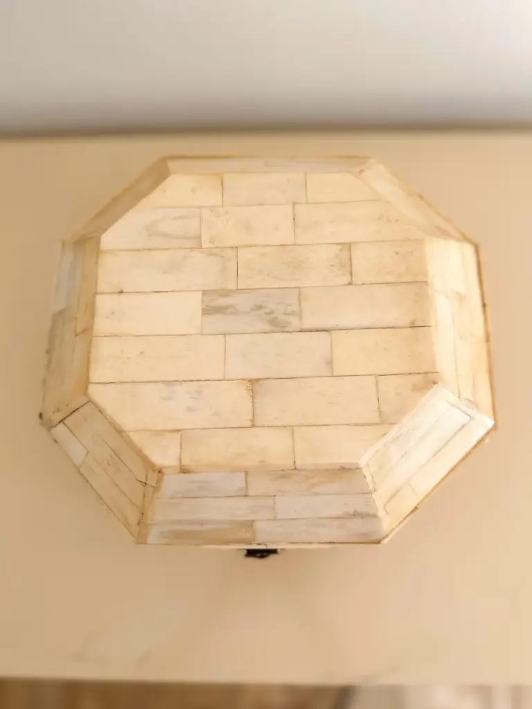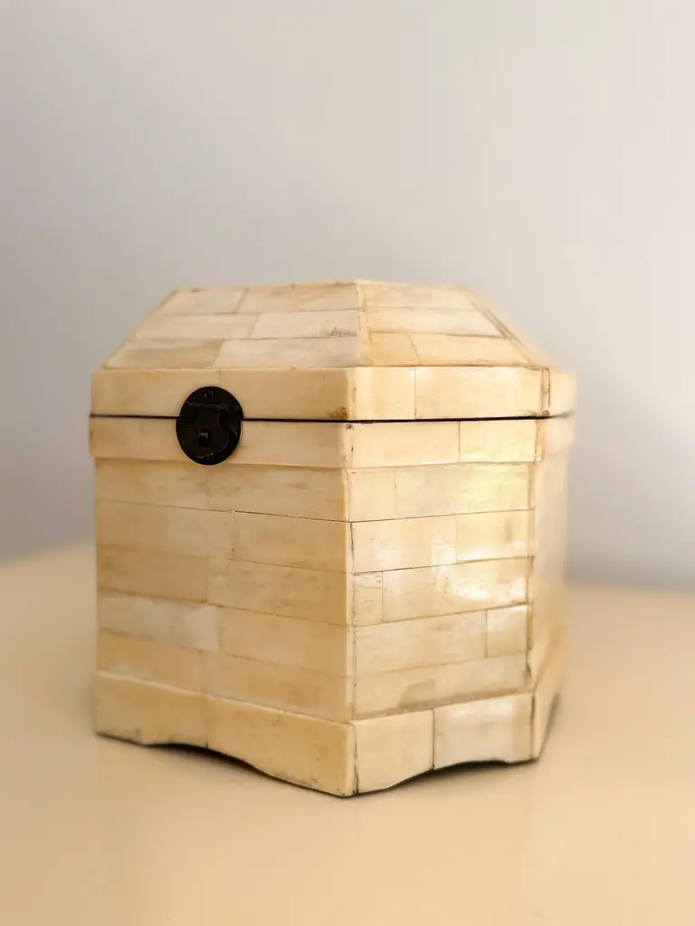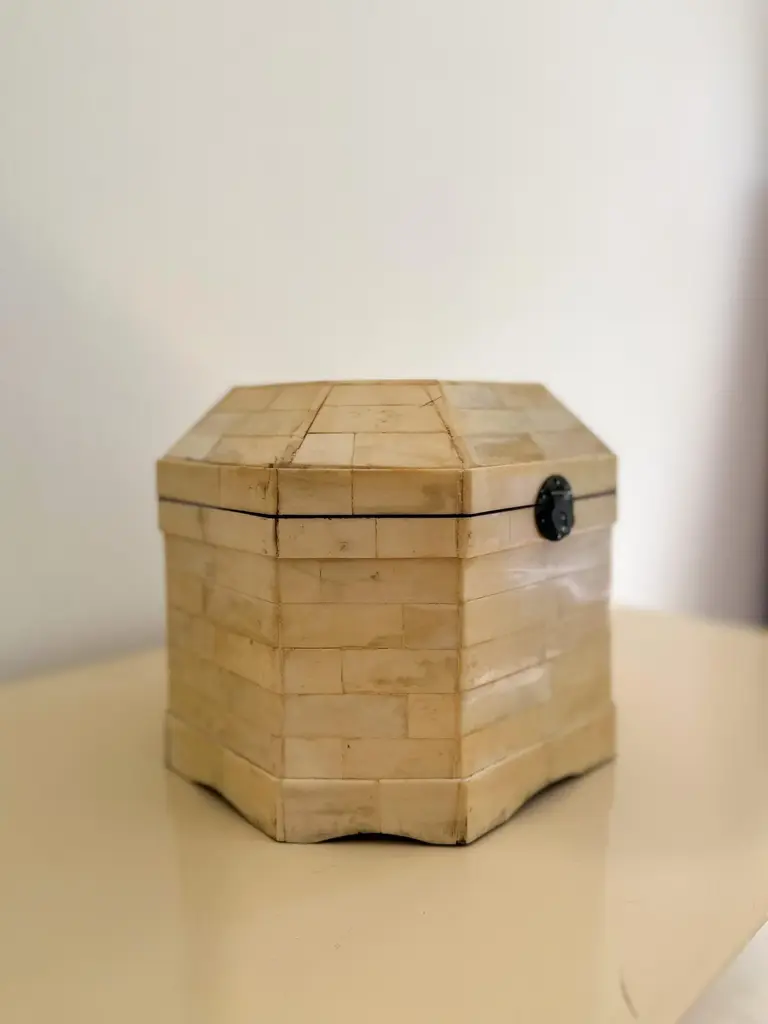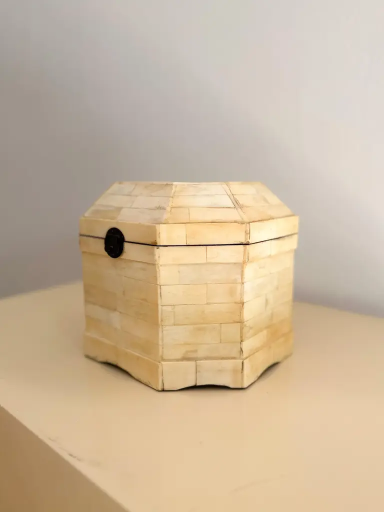 Vintage octagonal boxes made of ivory bone in a brick pattern, with maroon velvet lining and a brass clasp securing the hinged lid. These substantial boxes can fit loads of treasures. Two boxes are available and sold separately, each displaying light wear and discoloration as expected for their age.