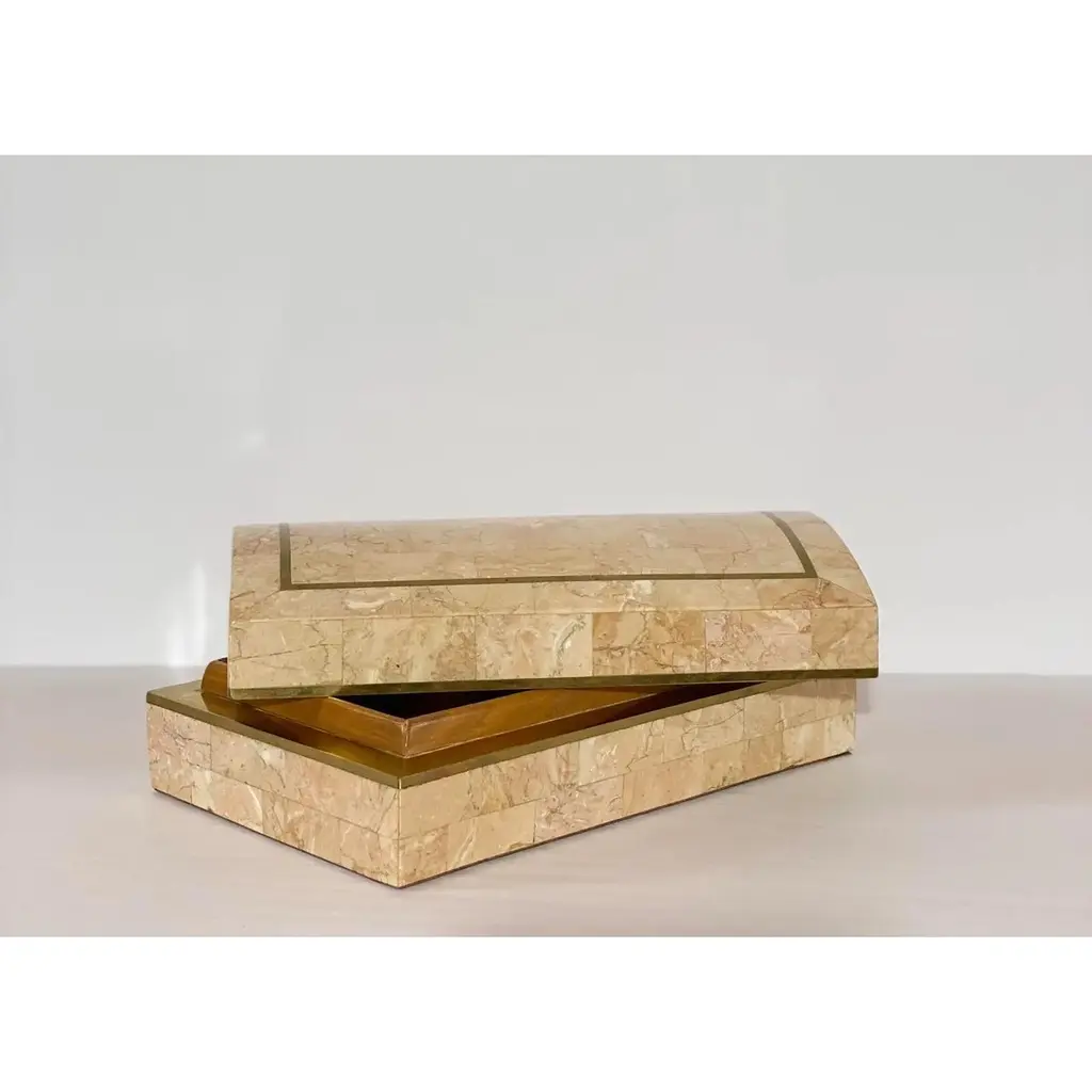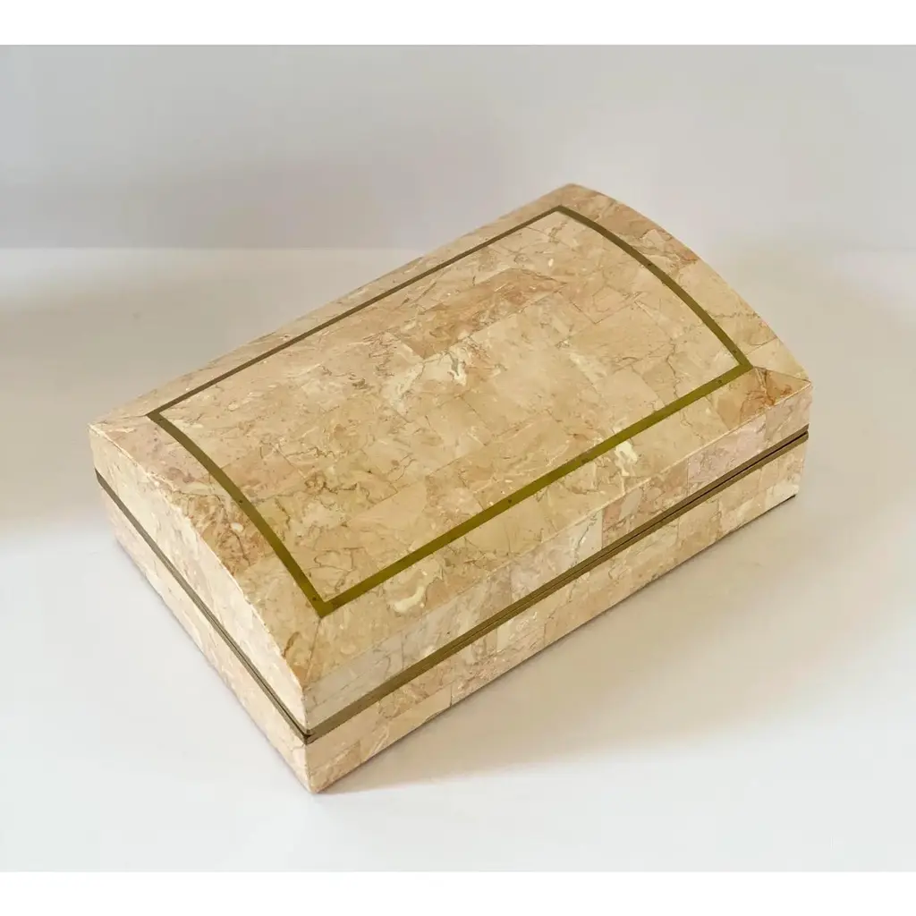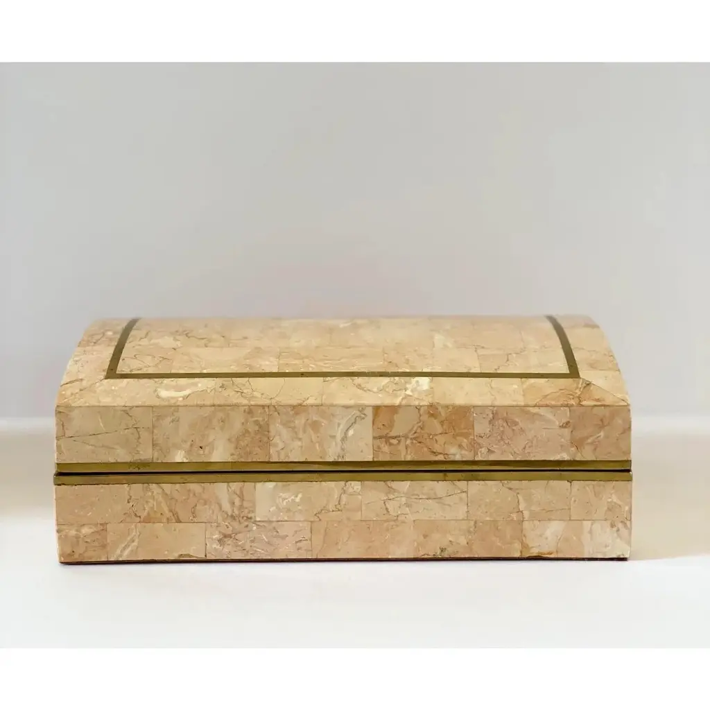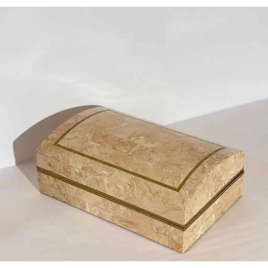 We are very pleased to offer a modern, tessellated stone storage box attributed to Maitland Smith, circa the 1980s. This gorgeous box features a tessellated stone exterior with inlaid brass trim. The curved dome lid opens to unveil a maple-brown wood interior to store items. In excellent condition consistent with age and wear. Please see all attached pictures.