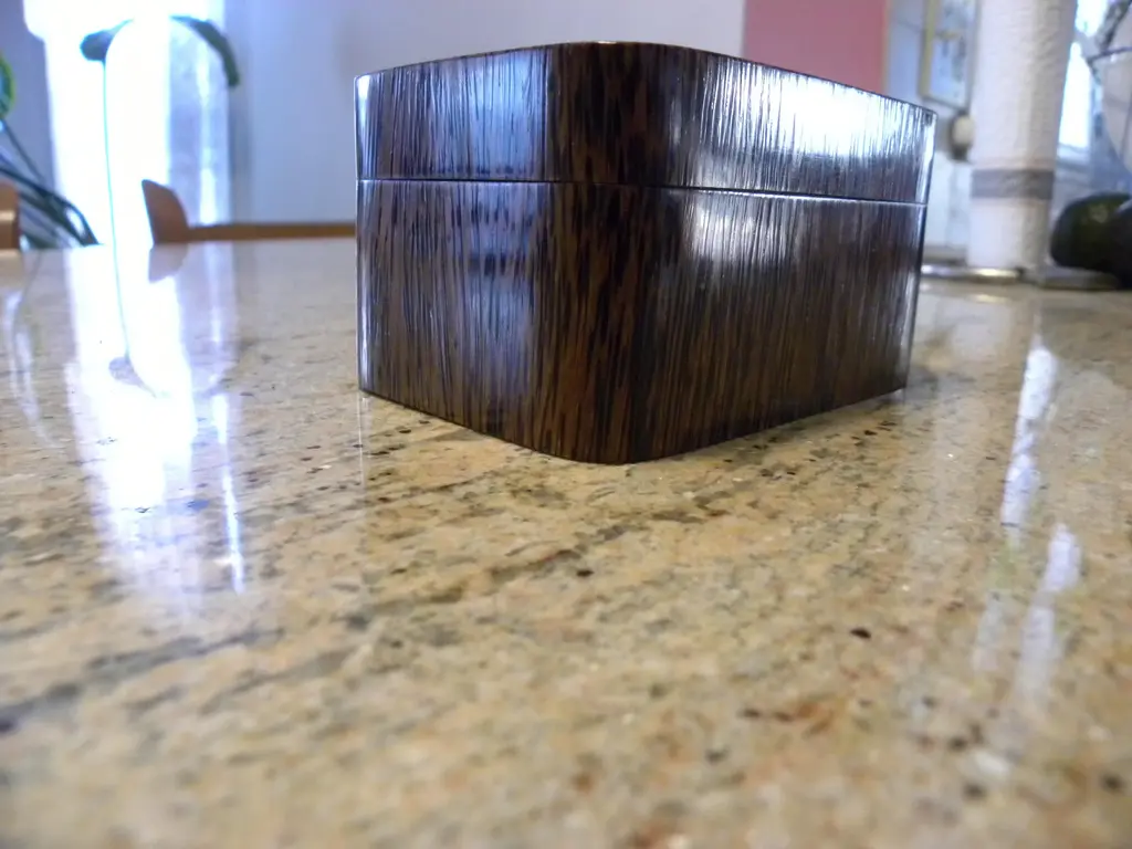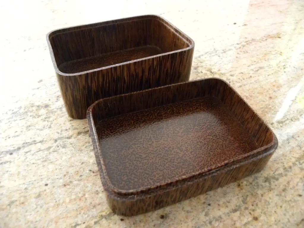 Both the body and lid of this jewelry -- or trinket -- box has been hollowed out of the same block of coconut palm wood so that the peculiar dotted pattern of the end-grain shows on the top of the lid and inside bottom of the box. It also means that the grain and color of the wood of the lid matches that of the body. The lid has been precisely fashioned to fit onto the body snugly but not too tightly. Such palm wood as this is extremely hard and can only be found in trees that are around 100 years old or more. I designed and made a number of these boxes in various shapes about 25 years ago in the Philippines, but I gave up as the wood was so hard that it damaged my tools. I just have a few left. The overall horizontal dimensions are 4 1/2 inches by 3 1/8 inches and the height is 2 1/2 inches. The thickness of the material in the sides and bottom is about 1/8 inch. They are finished in polished shellac. These pieces are almost certainly unique in the world and in history. The templates have long since been destroyed by termites and secret of how to make them will most likely die with me. This piece is, of course, unused and in new condition.