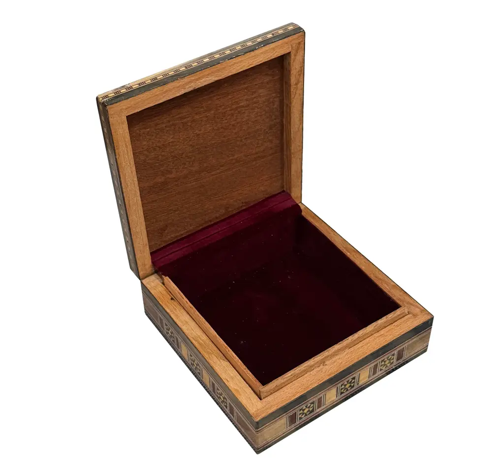 Middle Eastern marquetry inlay jewelry box for decor. This vintage box made of combination of natural wood, walnut wood, rose wood, lemon wood and olive wood and touch of natural mother of pearl. each kind of wood has different color giving this box beautiful contrast. The inside upholstered with velvet.