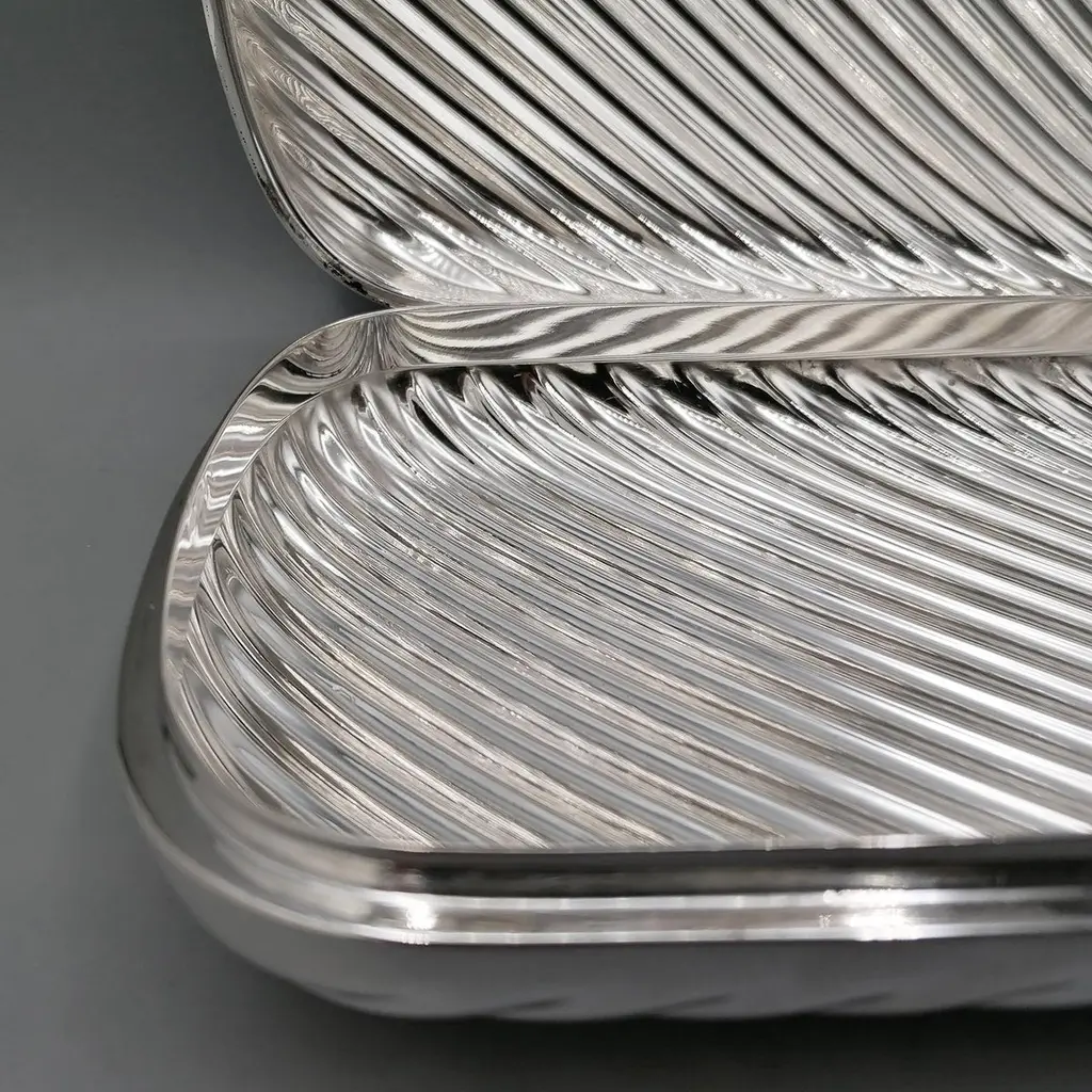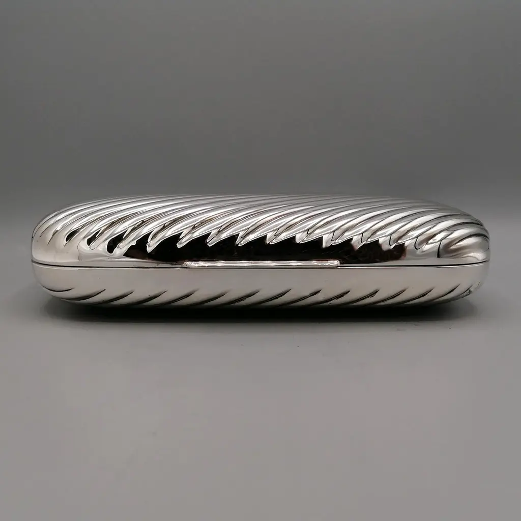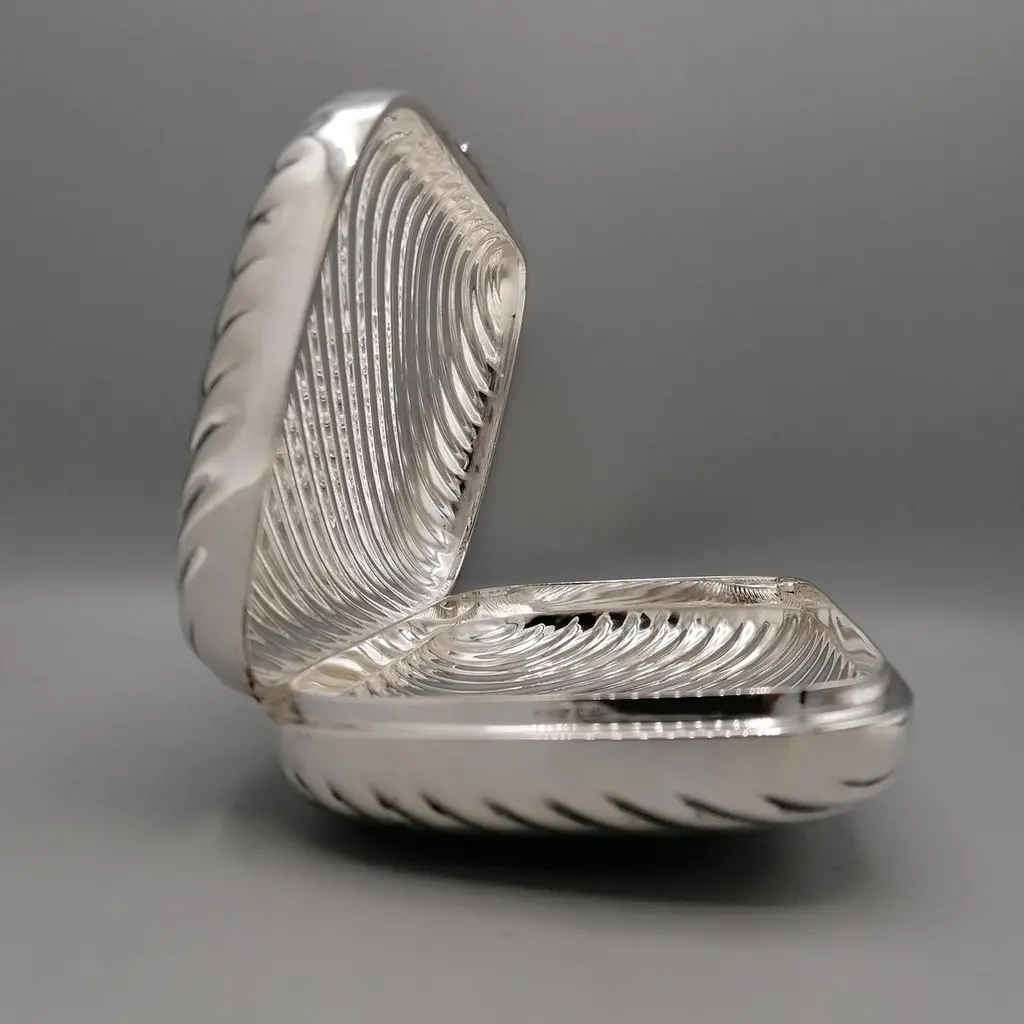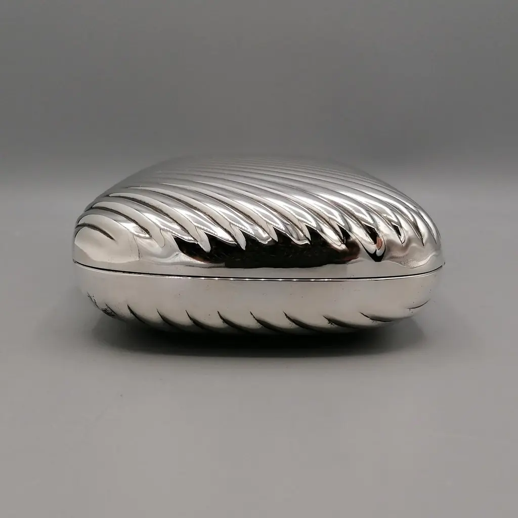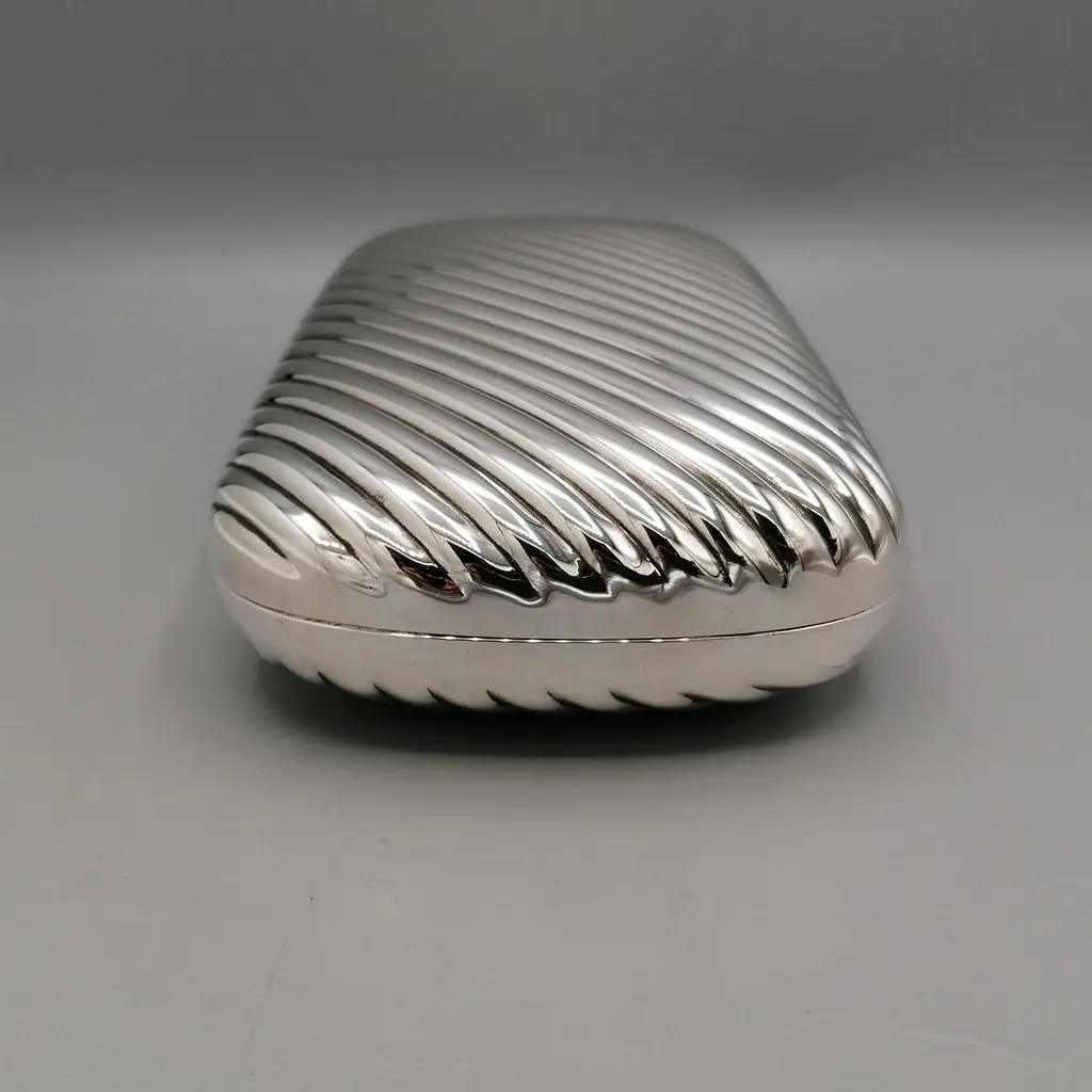 Hinged Sterling Silver Box.The box is embossed and chiselled with diagonal lines, leaving the central part smooth and shiny to interpose a different space between the workings.The shape is oblong, with the shape of a "convex soap."In the central part a small silver plate has been soldered in order to make the box opening easier.Truly proportionate in shape, this box, being multipurpose, is suitable to be placed in any style and décor. Perfect for minimal and modern furnishings, it is equally suitable for being placed in an antique-style house.Made in Florence - Italy by the Goldsilver Fani silverware factory based on a design by ARVAL ARGENTI VALENZA