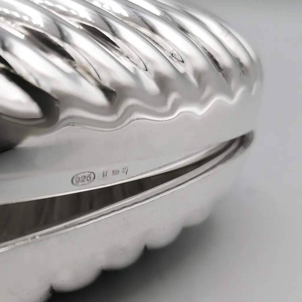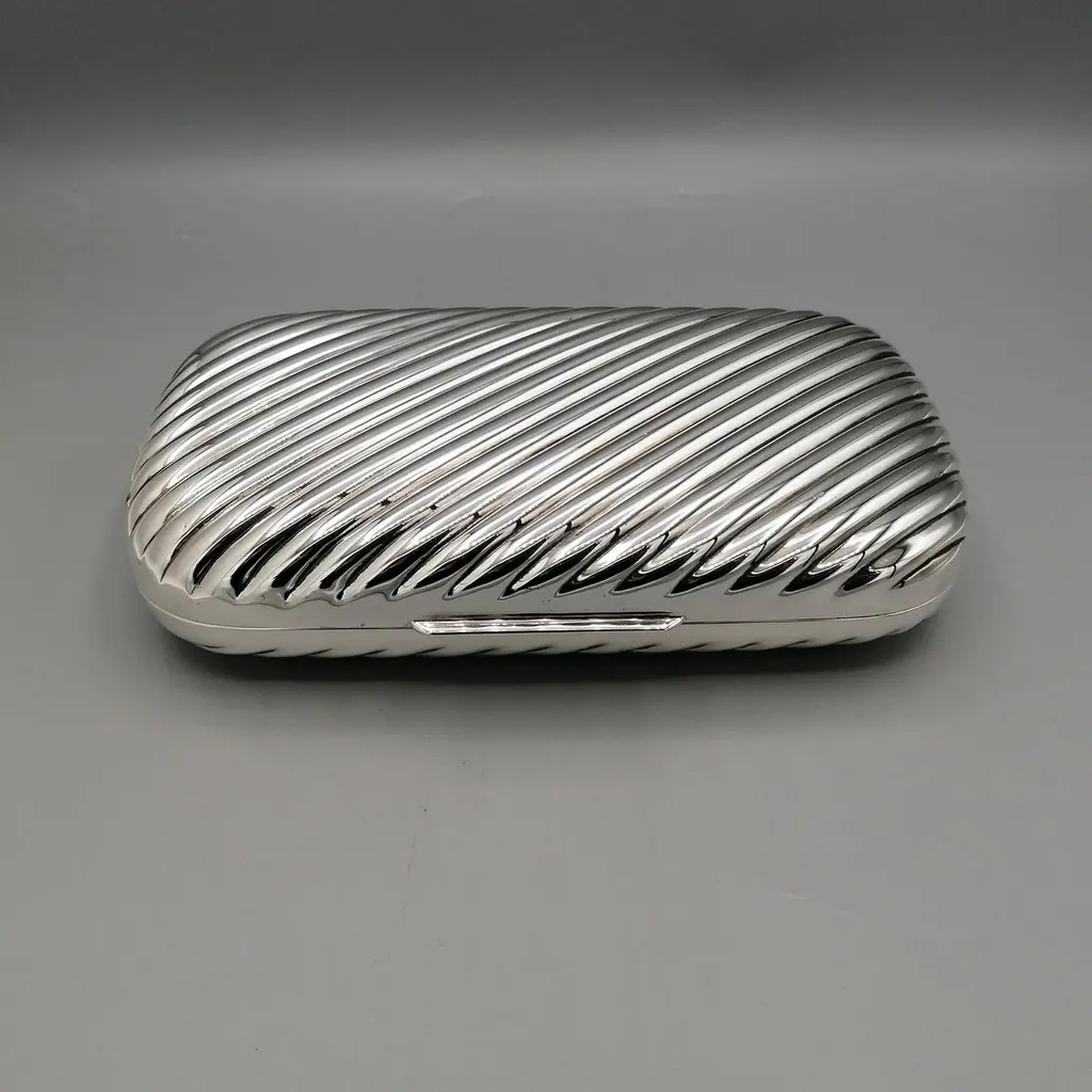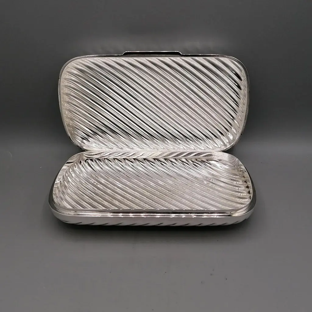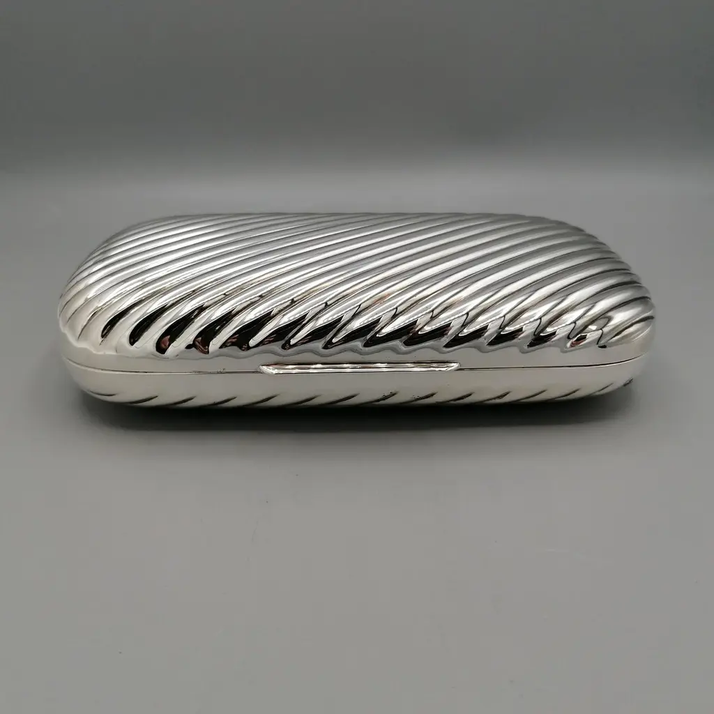 Hinged Sterling Silver Box.The box is embossed and chiselled with diagonal lines, leaving the central part smooth and shiny to interpose a different space between the workings.The shape is oblong, with the shape of a "convex soap."In the central part a small silver plate has been soldered in order to make the box opening easier.Truly proportionate in shape, this box, being multipurpose, is suitable to be placed in any style and décor. Perfect for minimal and modern furnishings, it is equally suitable for being placed in an antique-style house.Made in Florence - Italy by the Goldsilver Fani silverware factory based on a design by ARVAL ARGENTI VALENZA
