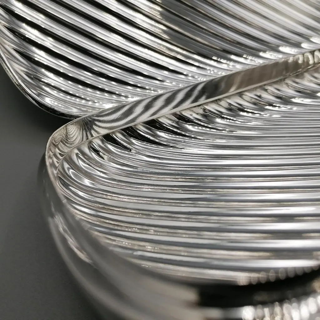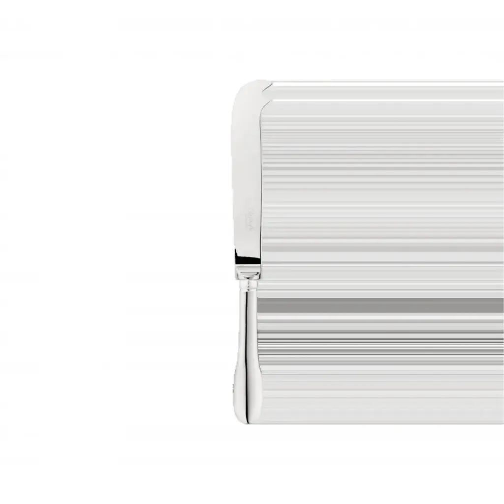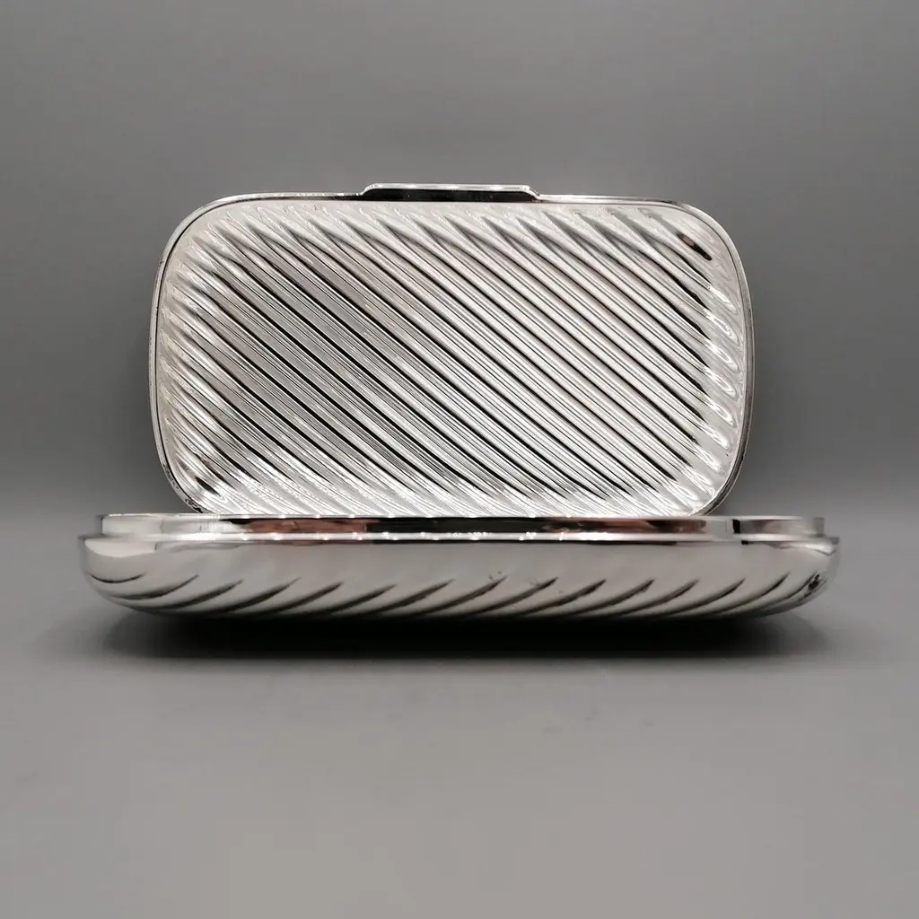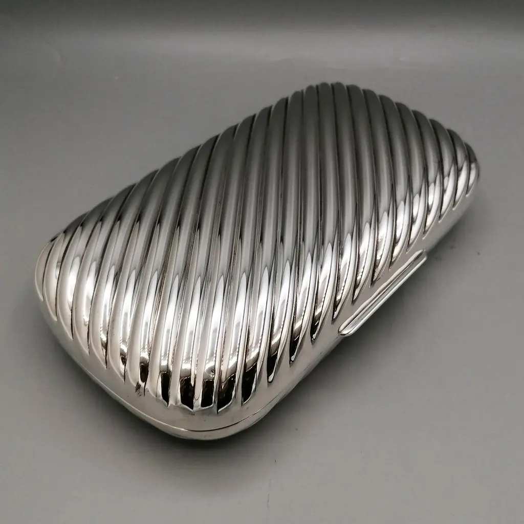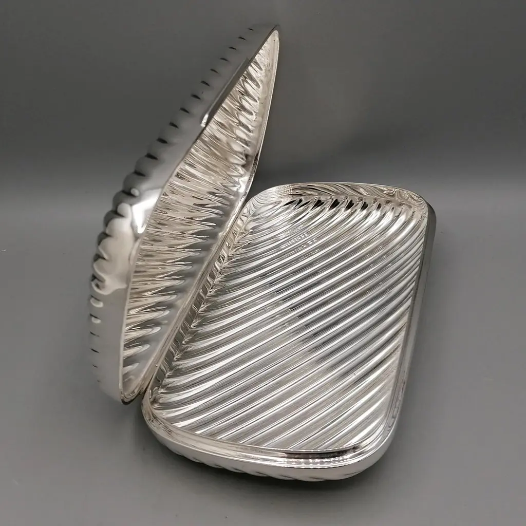 Hinged Sterling Silver Box.The box is embossed and chiselled with diagonal lines, leaving the central part smooth and shiny to interpose a different space between the workings.The shape is oblong, with the shape of a "convex soap."In the central part a small silver plate has been soldered in order to make the box opening easier.Truly proportionate in shape, this box, being multipurpose, is suitable to be placed in any style and décor. Perfect for minimal and modern furnishings, it is equally suitable for being placed in an antique-style house.Made in Florence - Italy by the Goldsilver Fani silverware factory based on a design by ARVAL ARGENTI VALENZA