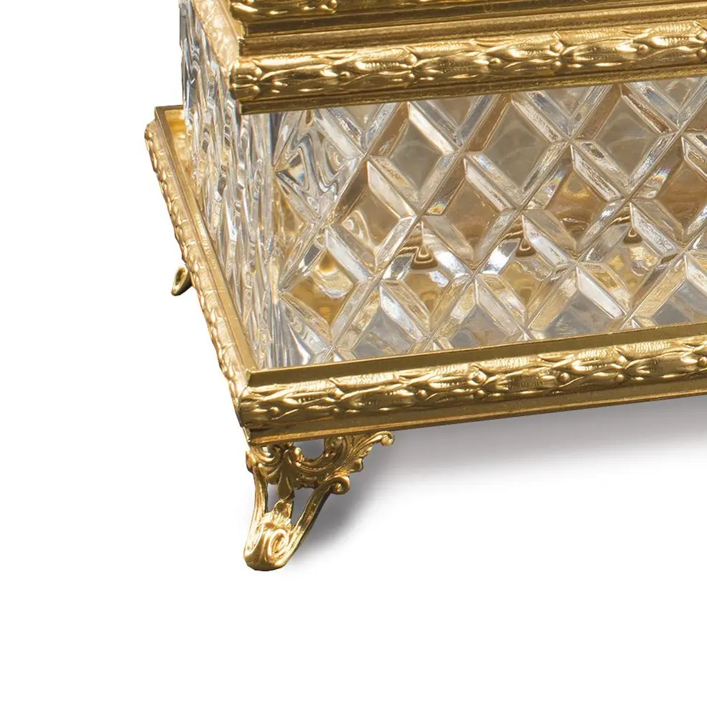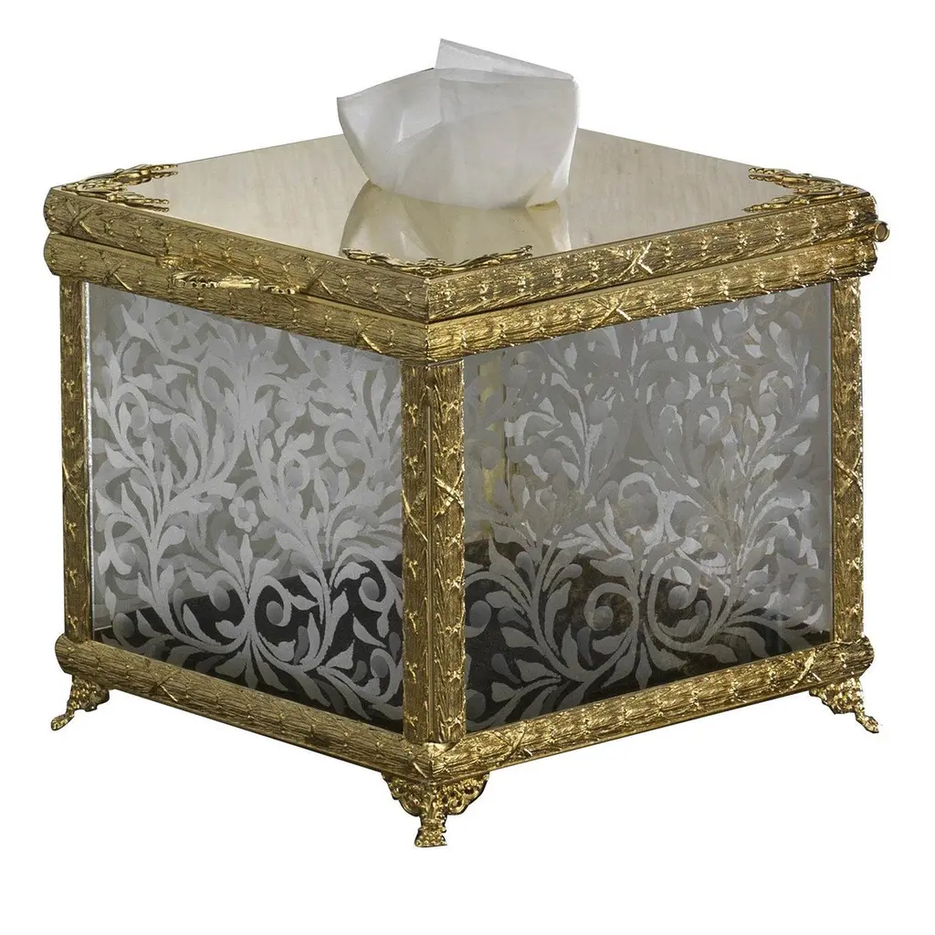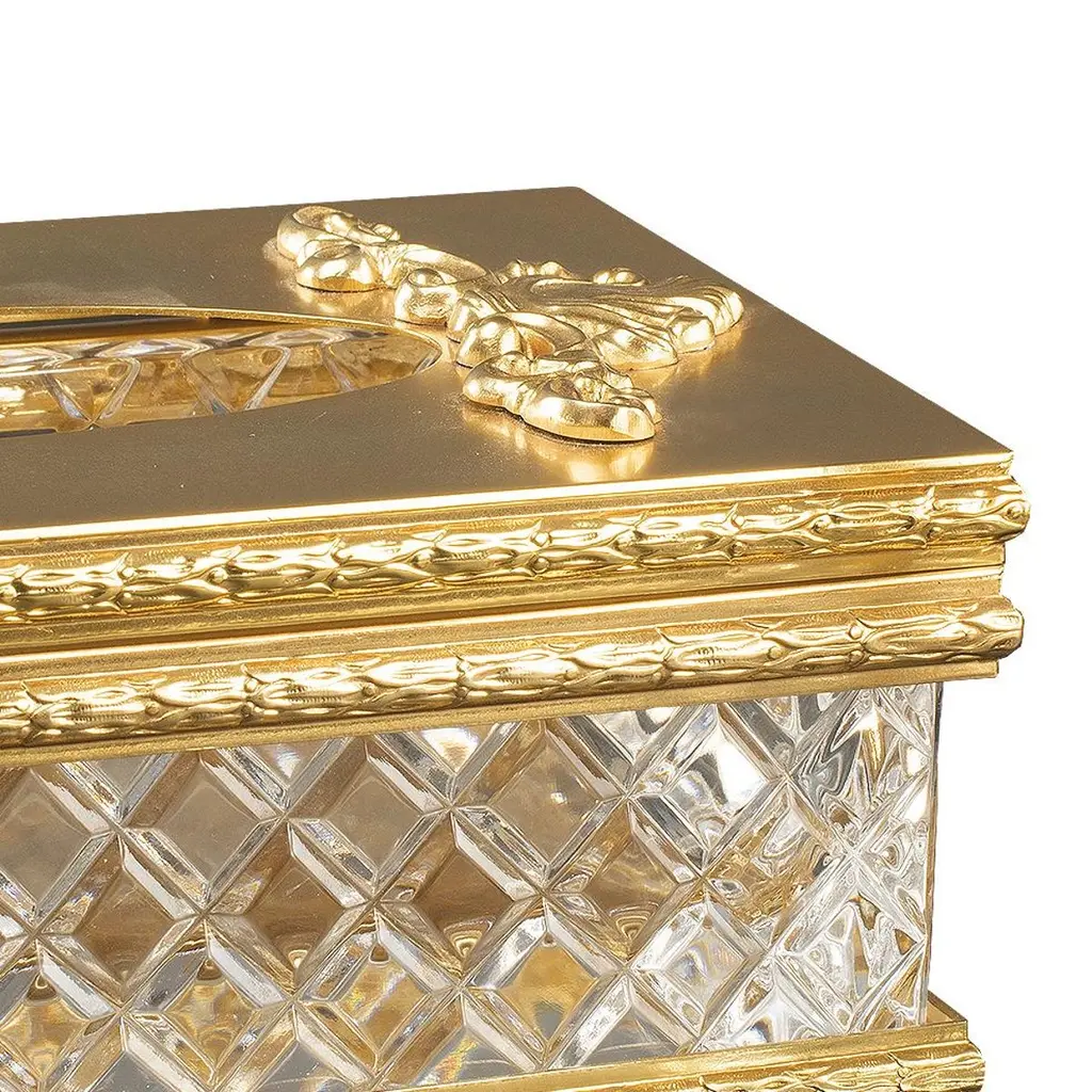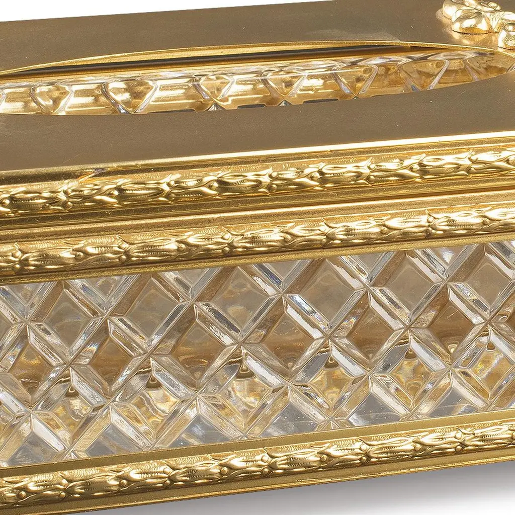 Hand carved clear crystal and patinated golden bronze clinex-holder. Each object is handcrafted and the care for every detail makes each item unique in its kind.The style of this Klinex-holder is a modern reinterpretation of an object from the second half of the 18th century in France.Also Oggetti d'Arte will follow with the same passion the request of the most qualified studies of interior architecture from around the world, helping them in achievement of their most ambitious projects.This Klinex-holder, at the customer's request, can be made with different metal finishes: French gold, old silver, patinated silver, chrome, nikel, burnished and with different crystal colors: pink, green, amber so that it can be inserted in the best possible way within your furniture. If you required a different color of crystal the price list change.