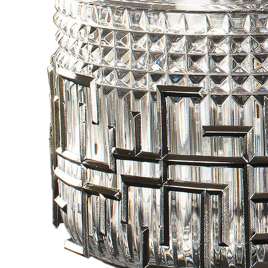 21st century, clear hand-carved crystal, chromed bronze box with intricate detailing and a bold geometric style. The domed lid features a radiant sunburst pattern, topped with a unique double-square handle that recalls classic Art Deco motifs. The body showcases a rich and dimensional texture, combining pyramid-shaped reliefs with an interlocking pattern of vertical and horizontal lines – a sophisticated and modern visual effect. This item can also be customized upon request - both the crystal color: amber, pink, amethyst and the bronze finish: golden, patinated gold, burnished, dark burnished... can be tailored to the client's preferences, making each piece truly unique. A refined and elegant item, ideal for collectors, vi225ntage design enthusiasts, or anyone looking to enhance their decor with a distinctive and artistic touch.