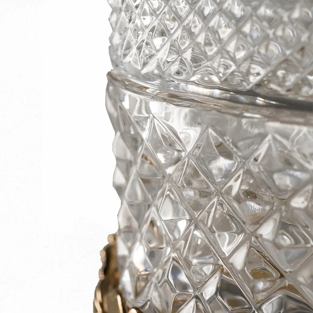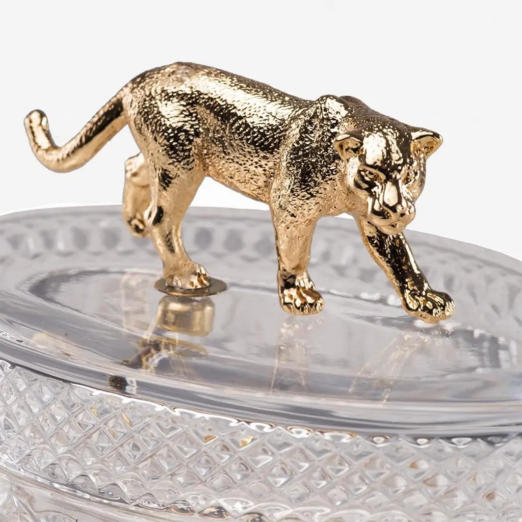 Hand-carved clear crystal box with Panther made with the artisan lost wax technique with patinated gold finish. This box has got a oval shape. Each object is handcrafted and the care for every detail makes each item unique in its kind.The style of this box is a modern reinterpretation of an object from the second half of the 18th century in France.Also Oggetti d'Arte will follow with the same passion the request of the most qualified studies of interio architecture from around the world, helping them in achievement of their most ambitious projects.This box, at the customer's request, can be made with different metal finishes and with different crystal colors so that it can be inserted in the best possible way within your furniture.