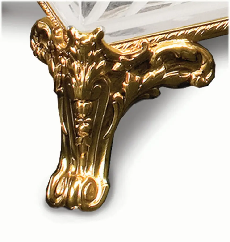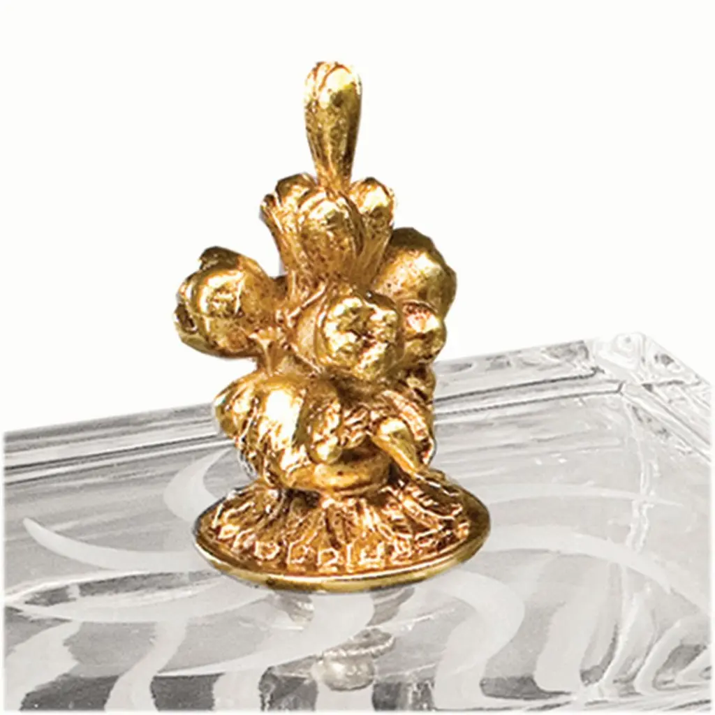 Clear crystal box with opaque cut engravings embellished with brass detail made with the artisan lost wax technique with patinated gold finish. Each object is handcrafted and the care for every detail makes each item unique in its kind.The style of this box is a modern reinterpretation of an object from the second half of the 18th century in France.Also Oggetti d'Arte will follow with the same passion the request of the most qualified studies of interio architecture from around the world, helping them in achievement of their most ambitious projects.This box, at the customer's request, can be made with different metal finishes and with different crystal colors so that it can be inserted in the best possible way within your furniture.