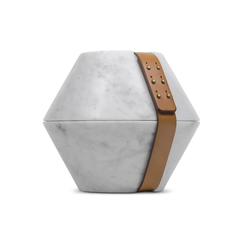 The refinement of resin meets the softness of italian leather.An elegant lid with a mother of pearl look beautifully complete the hexagonal bases fully covered inside and outside with calf leather. The handle crafted with a matching finish adds a touch of shiny thanks to the gold detail. Four different dimensions that come in a wide range of leathers and colors. Contact us for more customizations.