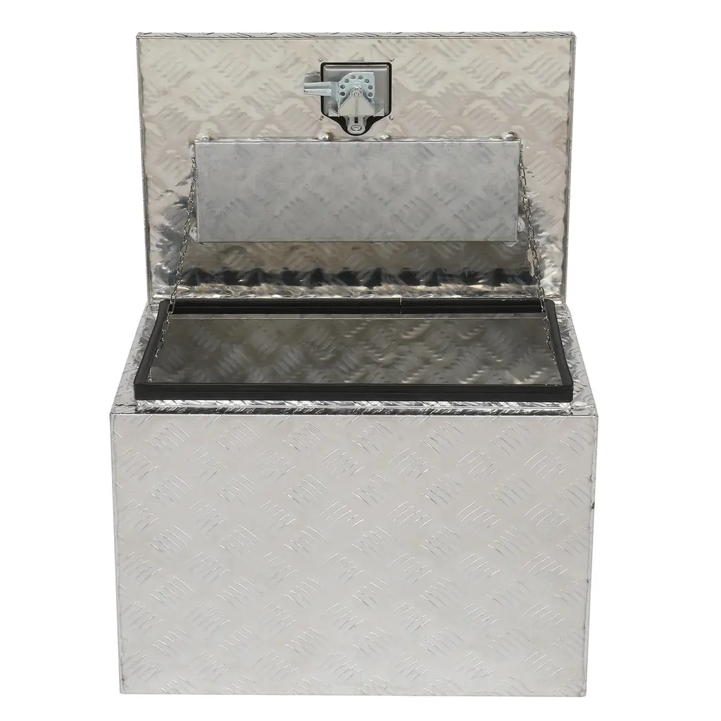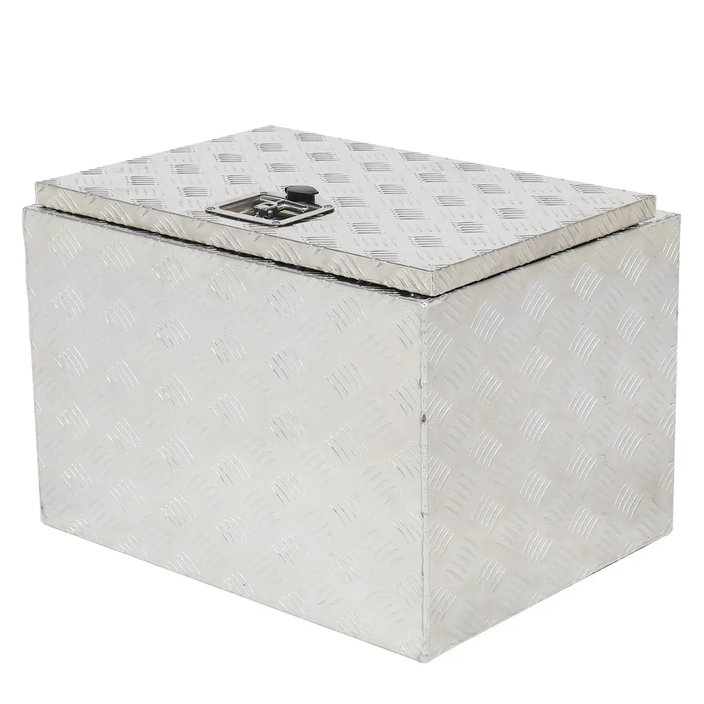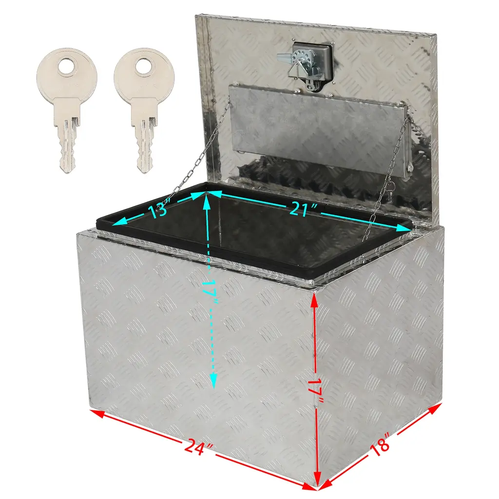 Features: 1. Necessary for families, truck drivers, and outdoor enthusiasts 2. With the durable material and sturdy shell design, it features long-lasting use time 3. Provide all the space and storage for your tools and accessories 4. Brand new and high quality 5. Produced by the sophisticated technology, durable in useSpecifications: 1. Product Dimensions: (24 x 18 x 17)" / (61 x 45 x 43)cm (L x W x H) 2. Tread: 5 Bar Tread 3. Material: Aluminum 4. Weight: 17lb / 8kg 5. Color: Silver 6. Position: UnderbodyPackage Includes: 1 x Aluminum Tool Box 2 x Keys