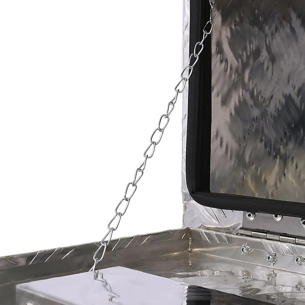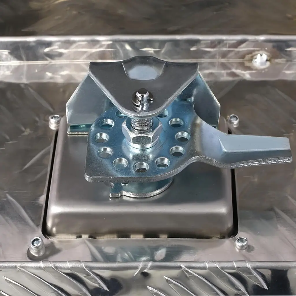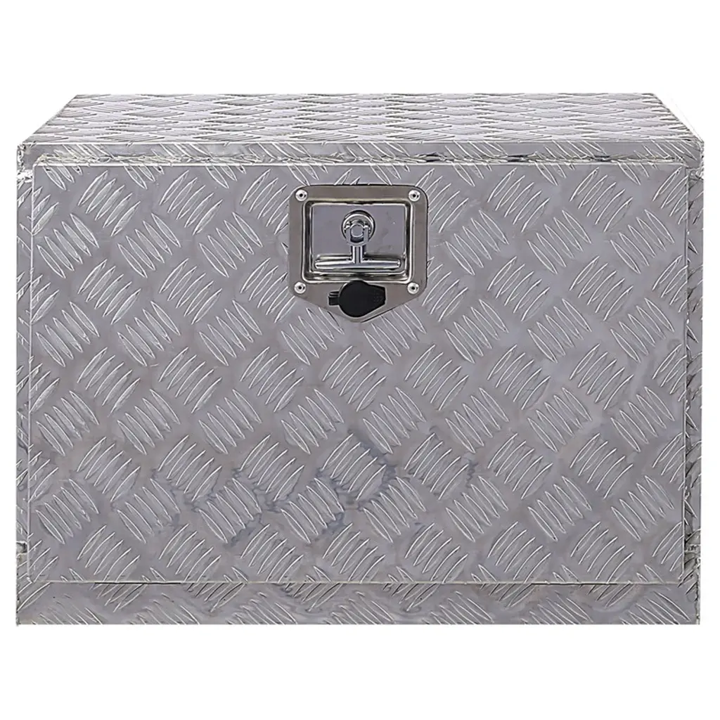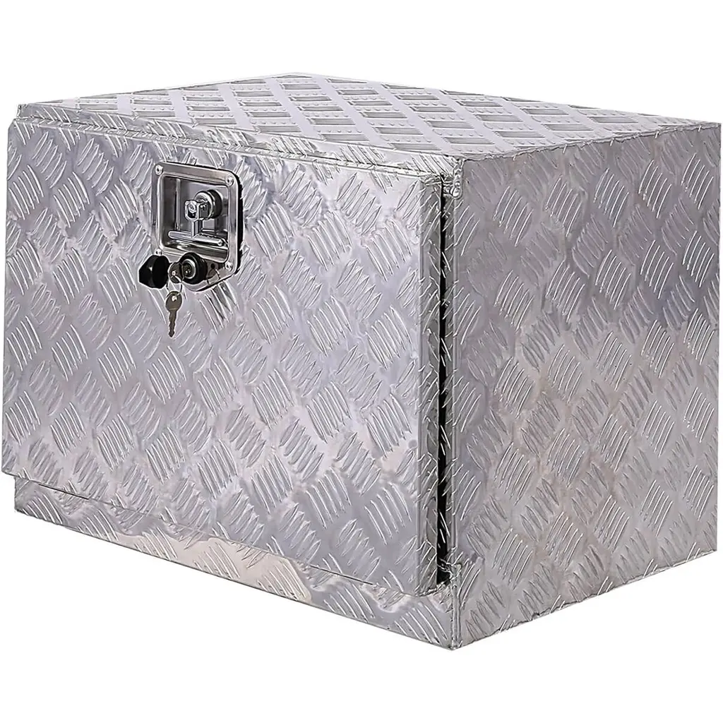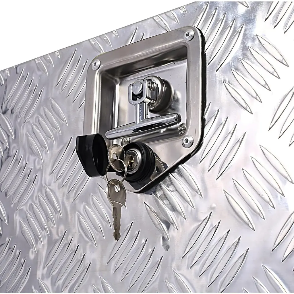 Aluminum Material: Engineered to offer high-intensity and corrosion resistance, ensuring that your tools and equipment are well-protected from external elements. The seal ring design prevents water and other external factors from penetrating inside. Lightweight Yet Sturdy: The lightweight design of this truck toolbox means it won't add significant weight to your tractor, trailer, or truck. It's also incredibly sturdy, thanks to the 5 bar pattern that reinforces the aluminum. Ample Storage Space: With an overall size of 24"(L) x 17.3"(W) x 17.7"(H), this trailer tool box provides enough storage space to accommodate various tools and accessories, making it ideal for domestic use, garages, and DIY projects. Versatile Mounting: The perfect tool cabinet for anywhere, you can easily mount this tool box on the hitch rack, cargo rack of your camper, tongue of your enclosed trailer, or even at the rear of your RV for extra storage. Secure: Comes with a lock and 2 keys to keep your tools secure and prevent them from getting lost.