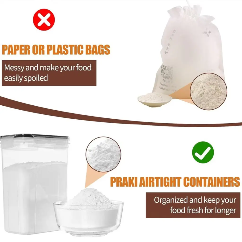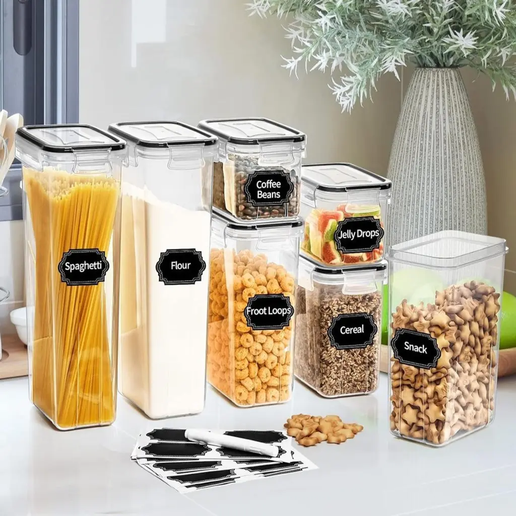 BRINJOY 24-Piece Airtight Food Storage Container Set offers the perfect solution for organizing your kitchen pantry. These interlocking containers feature four different sizes (0.8L to 2.8L) to accommodate various dry foods while maintaining a uniform external appearance. Made from high-quality BPA-free plastic, they ensure food safety and freshness for all your kitchen staples. The set includes 40 chalkboard labels and a white marker for easy content identification. The transparent design allows quick visibility of contents, while the stackable design maximizes storage space. Perfect for storing flour, sugar, pasta, rice, nuts, and cereals, these containers help create an organized and efficient kitchen environment. Product Selling Points Smart Interlocking Design System Features 24 containers in four sizes (6x0.8L, 6x1.4L, 6x2L, 6x2.8L) with uniform external dimensions that interlock neatly while offering different internal capacities for various storage needs. Advanced Airtight Preservation Technology Equipped with silicone seals and four-point locking lids that create a watertight and airtight barrier, keeping ingredients fresh and protected from moisture and air exposure. Space-Optimized Stackable Storage Designed with interlocking and stacking capabilities that maximize cabinet space while maintaining stability and organization in your pantry or cupboard. Complete Labeling Organization System Includes 40 chalkboard labels and a white marker for easy content identification, eliminating confusion between similar-looking ingredients while maintaining a clean aesthetic. Premium Safe Material Construction Made from high-quality BPA-free plastic that is dishwasher-safe (container base) and designed for long-term food storage safety and family health protection.