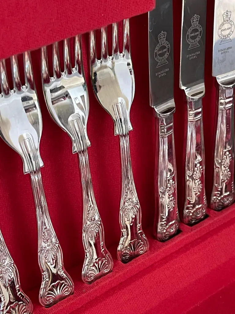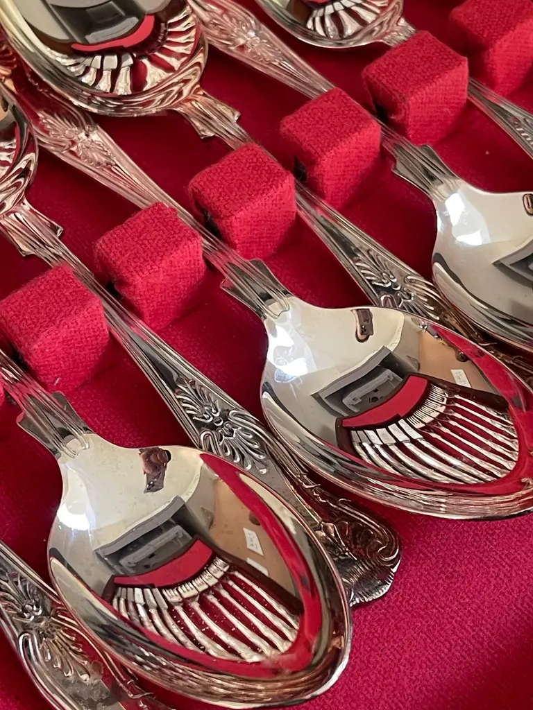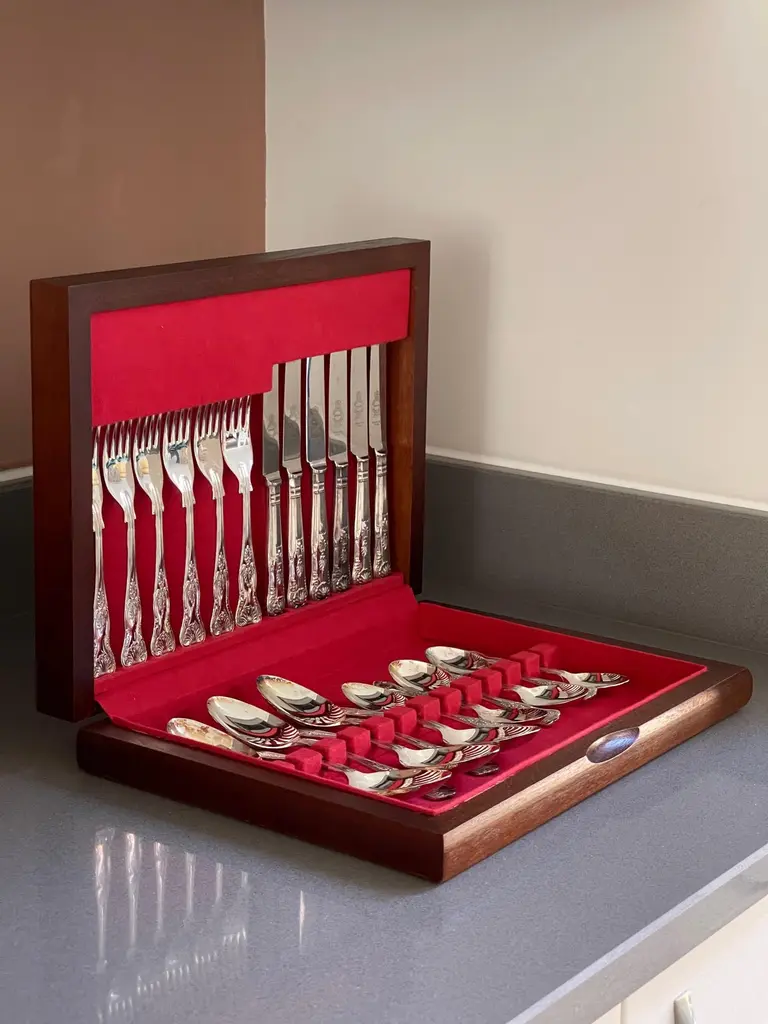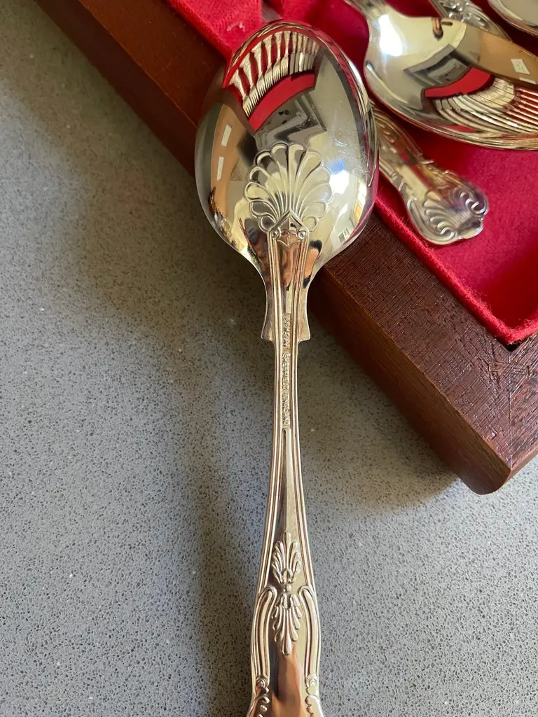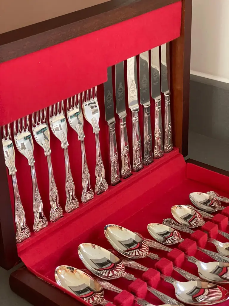 A Rare case set of 24 silver plated antique valuable luxury handle sterling silver dining cutlery spoons, forks, knives and coffee spoons ... a set of everything for 6 individuals.This impressive set includes a beautiful mahogany wooden case 1940. All the silver plated cutlery’s set knives only are including stainless steel blade for several reasons listed as below:🔪 Why Silver Cutlery Has Steel Blades – Key Points• Silver is too soft to make a durable, sharp knife blade.• Stainless steel is more hygienic, non-reactive, and easier to clean.• Helps prevent food contamination and metallic taste.• Steel is stronger and holds a cutting edge better• Stainless steel (rust-resistant, food-safe).• Knives are constructed in two parts: steel blade fitted into a silver plated handle.• Silver plated handles are decorative, signaling luxury and wealth.• Hybrid design offers functionality (blade) + aesthetics (handle).• Stainless blades are easier to clean and maintain.• Common in EPNS (Electroplated Nickel Silver) and sterling sets.Condition: Excellent condition - barely used with minimal signs of wear.Highly collectable and valuable.It is in beautifully excellent condition and will be polished before shipping.