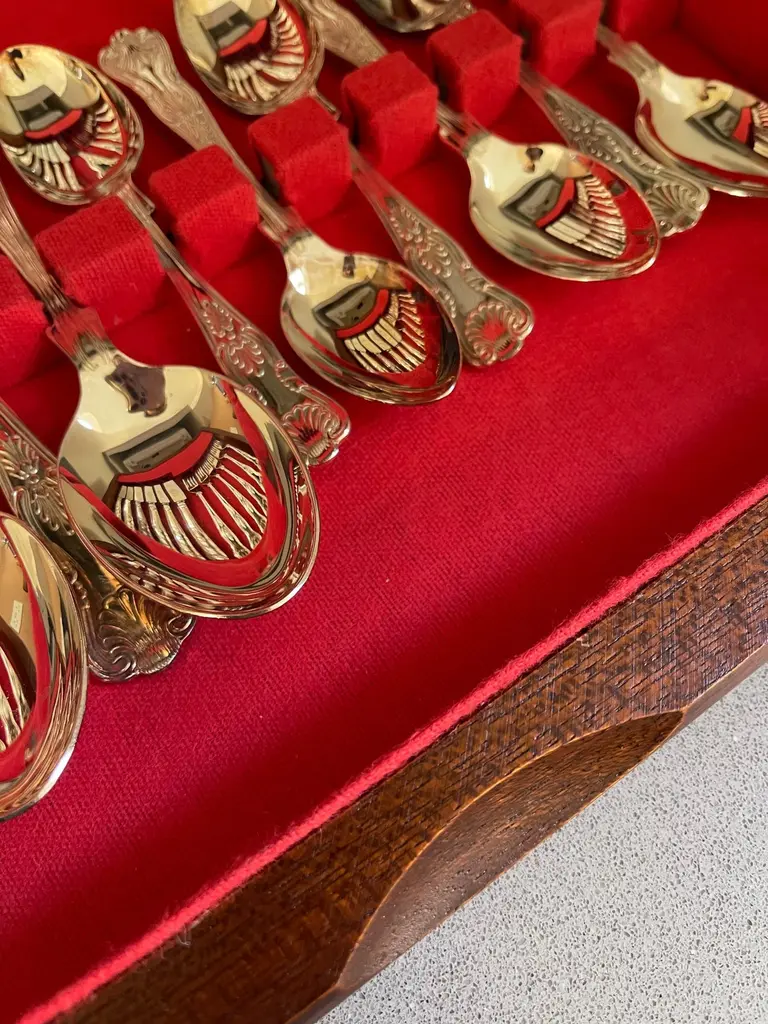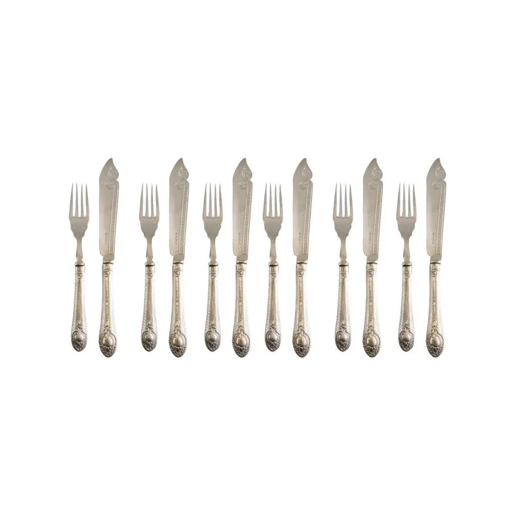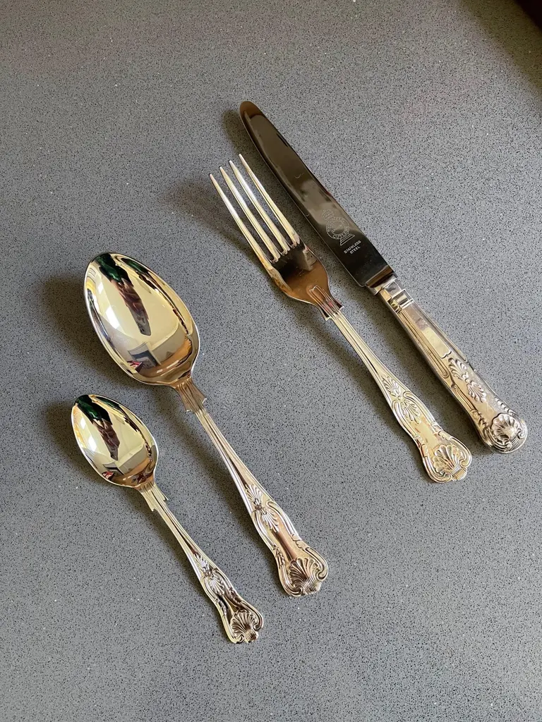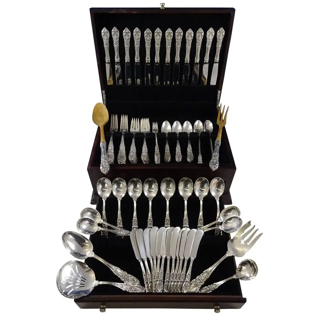 A Rare case set of 24 silver plated antique valuable luxury handle sterling silver dining cutlery spoons, forks, knives and coffee spoons ... a set of everything for 6 individuals.This impressive set includes a beautiful mahogany wooden case 1940. All the silver plated cutlery’s set knives only are including stainless steel blade for several reasons listed as below:🔪 Why Silver Cutlery Has Steel Blades – Key Points• Silver is too soft to make a durable, sharp knife blade.• Stainless steel is more hygienic, non-reactive, and easier to clean.• Helps prevent food contamination and metallic taste.• Steel is stronger and holds a cutting edge better• Stainless steel (rust-resistant, food-safe).• Knives are constructed in two parts: steel blade fitted into a silver plated handle.• Silver plated handles are decorative, signaling luxury and wealth.• Hybrid design offers functionality (blade) + aesthetics (handle).• Stainless blades are easier to clean and maintain.• Common in EPNS (Electroplated Nickel Silver) and sterling sets.Condition: Excellent condition - barely used with minimal signs of wear.Highly collectable and valuable.It is in beautifully excellent condition and will be polished before shipping.