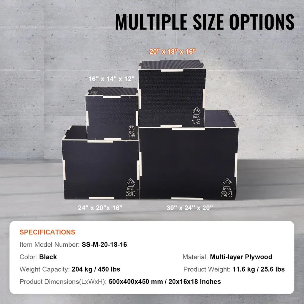 Multiple Sizes: Choose the right exercise tool for your needs and enhance your training with different height settings. Suitable for all levels, from beginners to professionals, this plyo box is perfect for home gym setups. 3 Adjustable Heights: With its unique design featuring three different heights, you can challenge yourself and break your limits. This plyometric platform box is suitable for exercises like step-ups, push-ups, and deep squats, it's perfect for personalized training to improve the shoulders, arms, chest, hips, legs, and overall core stability. For Cotton options: Durable Material: The upgraded non-slip surface material, using 1000D grip patterns, is more durable than standard 500D mesh fabric in terms of thread count and density. Filled with recycled cotton material, it adds overall weight and improves the stability of the product. It offers a substantial weight capacity of 440 pounds / 220 pounds, ensuring stability during high-intensity training. Safe and Reliable: Constructed with high-quality recycled cotton, our fitness exercise jump box provides a soft landing surface to prevent injuries during training. The surface features non-slip mesh fabric with increased friction for safety and stability, ensuring safe and effective workouts. No Installation Required: The one-piece plyo box is ready to use without installation, featuring a zipper design for easy disassembly and cleaning. The PVC covering allows for quick and convenient wiping clean of the box, eliminating dirt and footprints, maintaining hygiene and aesthetics in your workout space. For Wooden options: Professional Wooden Structure: Made with native wood, it is sturdy, eco-friendly, and stable. The inclusion of internal support ensures added stability during high-intensity training. With a weight capacity of 450 pounds, it meets various training needs and provides a stable environment for jump training. Safe and Reliable: The plyo box is designed with multiple sanding processes for smoothness, rounded edges to prevent hand injuries, and portable handles for easy movement. The surface features a honeycomb pattern for slip resistance, offering stability and grip to ensure safe and effective workouts. Easy to Assemble: Our fitness exercise jump box is very easy to assemble. It comes flat-packed, pre-cut, and pre-drilled - everything you need is included. You can assemble this product in less than 5 minutes. When not in use, the plyo boxes can be stacked or disassembled for convenient storage and transport. Package Content 1 x Plyometric Platform Box 1 x Set of Installation Accessories (only for Wooden options)