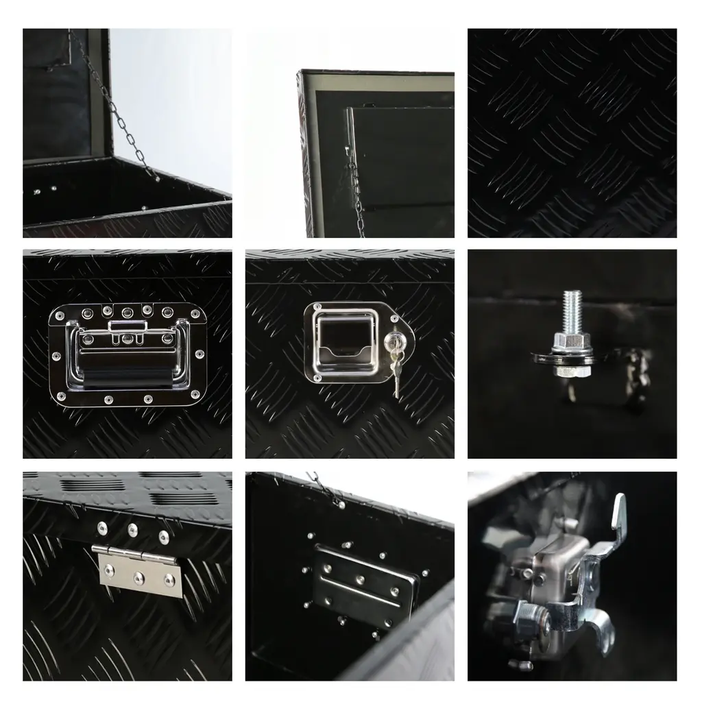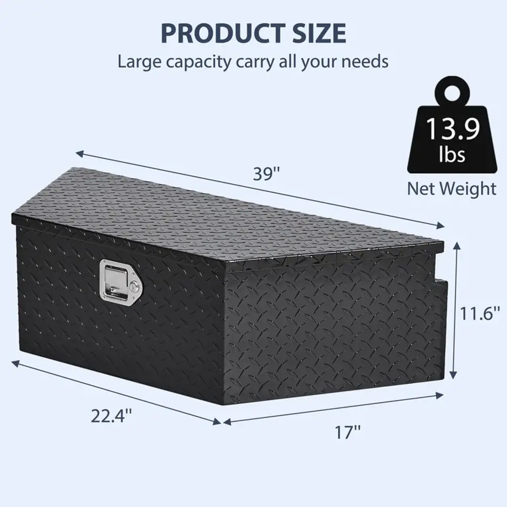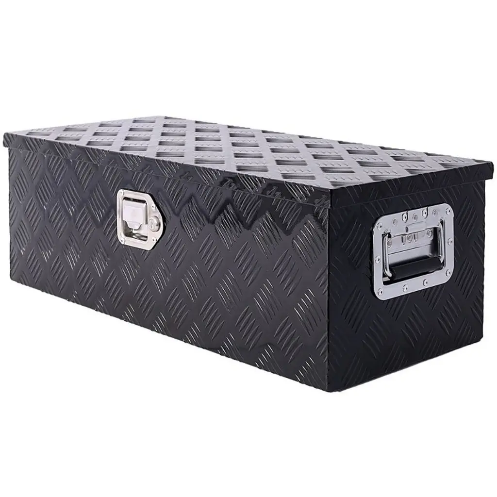 Durable and Sturdy: Powdercoated Black Aluminum Surface Finish, 5 Bar Tread Pattern Strengthens the Aluminum for Maximum Durability. High-quality and durable appearance make the Trailer Tool Box rarely needed to repair.Secure and Protective: A stainless steel latch keeps your tools and supplies secure, protecting against theft and weather elements.Fully welded seams can effectively protect internal cleanliness and prevent other external factors such as rain from entering.With Lock and 2 Keys: This aluminum box has a lock and 2 keys so you can safely use it to prevent things from being lost. Comes with 2 durable side handles for easy portable.More Storage: The drop door opens to provide full access to the contents of the box. Spacious cabinet offers plenty of storage for your tools, small items, accessories, camping supplies, and much more.Widely used: Aluminum truck tool box is perfect for mounting in trucks, RV, ATV, pickup, trailer, flatbed to load and unload tools, boards, safety chains, jacks, wrenches, crowbars, even vacation camping supplies.Description:Product Name: Truck Pickup Trailer Tool BoxMain Color: BlackMain Material: AluminumStyle: Long boxSize: 30" (30.1" x 12.8" x 10.4")Packing list:Truck Pickup Trailer Tool Box x 1Accessory Bag x 1Note:1. Due to manual measurement, please allow 1-3cm error. Make sure you dont mind before bidding.2. Due to the difference of different monitors, the picture may not reflect the actual color of the product. Thanks.