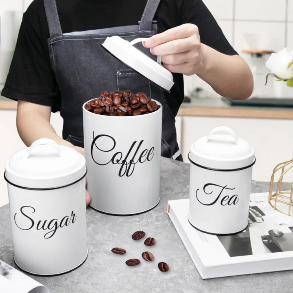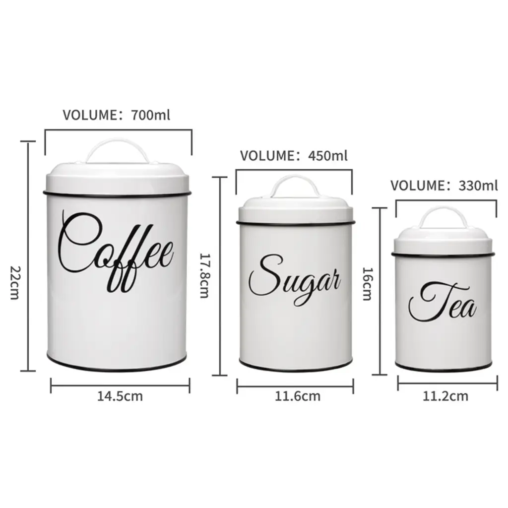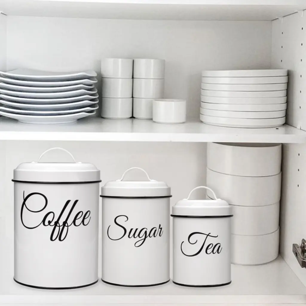 Introducing our stylish three-piece white storage canister set, designed to enhance your kitchen with elegance and functionality! Crafted from durable materials, each canister boasts a sleek, modern look that fits any decor. Ideal for storing tea, sugar, and coffee, the lids keep ingredients fresh while adding charm to your countertop. Perfect for organization or as a thoughtful gift! Product Highlights: -Durable farmhouse canisters in premium powder-coated galvanized steel. -Conveniently labeled large capacity storage canisters. -Lids for ingredient freshness and quality preservation. -Charming rustic design enhances farmhouse decor. -Ideal gift choice for kitchen enthusiasts. Specifications: Product Material: Metal Color:White Friendly Note: 1. To ensure maximum freshness, kindly make sure that the lids are tightly sealed after each use. This practice will help maintain the quality of your ingredients. 2. To preserve the aesthetic appeal and functionality of your canisters, we recommend cleaning them gently with a soft cloth and mild soap. Please refrain from using abrasive cleaners, as they may damage the surface finish.