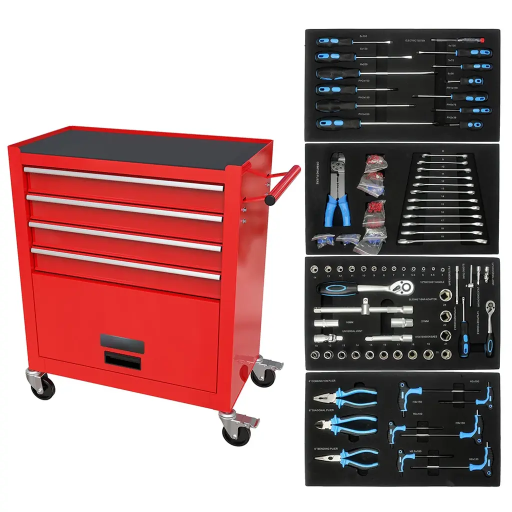 The metal storage cabinet comes with four wheels, two of which have parking brakes, so you can move the cabinet around freely or park in one place.The opening and closing of the drawers of the tool cabinet is very gentle thanks to the ball-bearing drawers.The storage surface provides additional space for storing and arranging tools you often need.The robust and powder-coated steel construction is used for high wear resistance.After tested: We are always committed to providing you with better products. We went through a very strict selection process from material to design.Description:Name: 4 Drawers Tool Cabinet with Tool SetsMain Material:SteelPacking list: 4-drawer tool cabinet with tool set x 1+accessory bag x 1