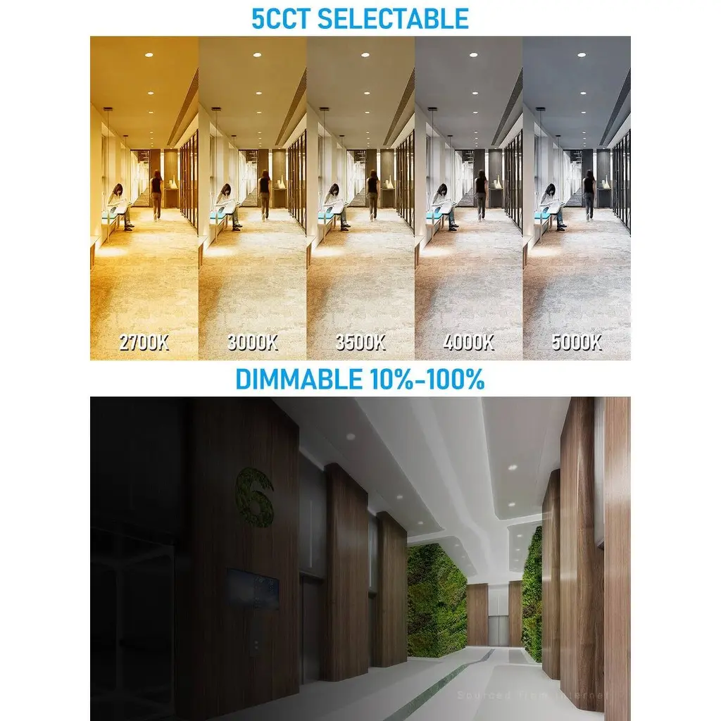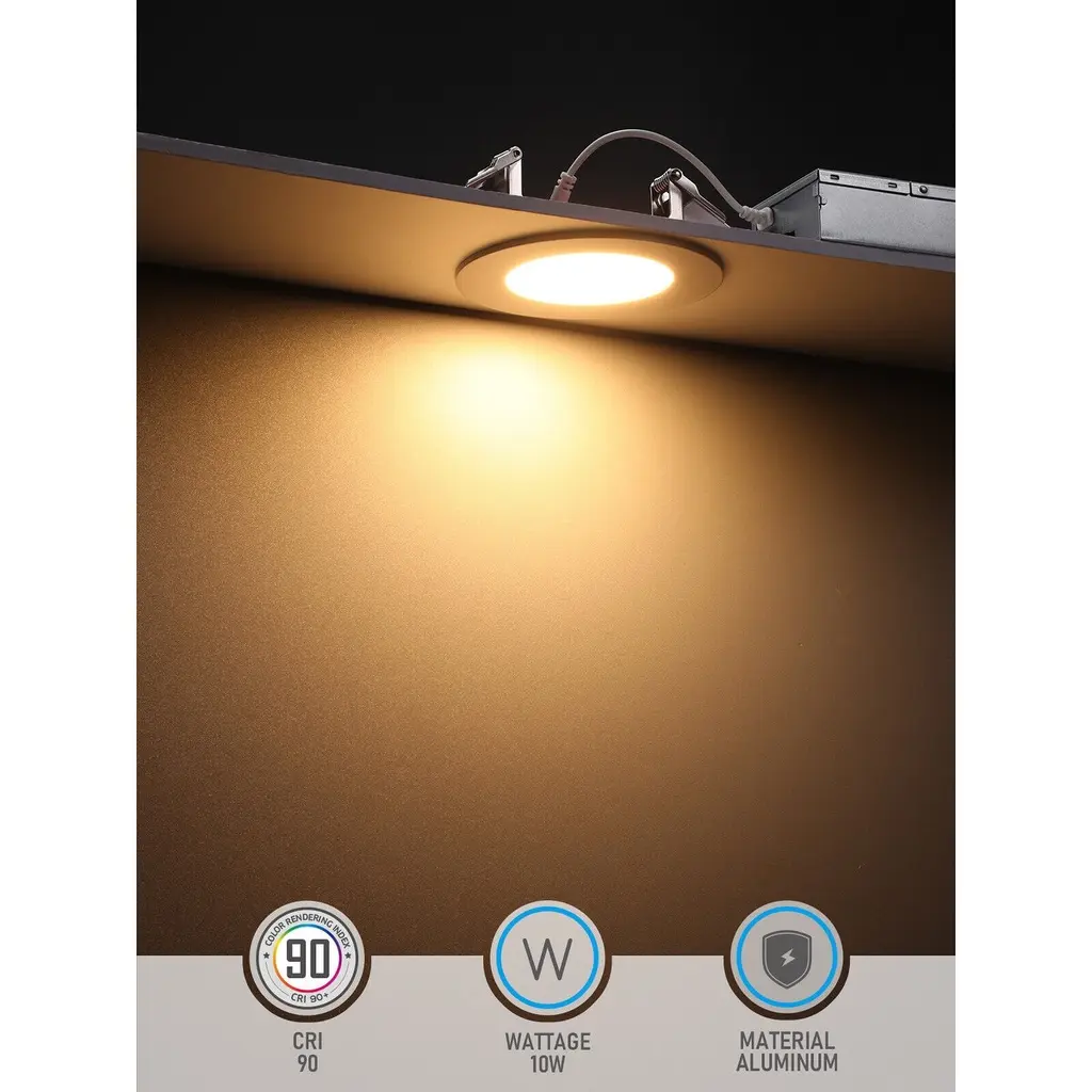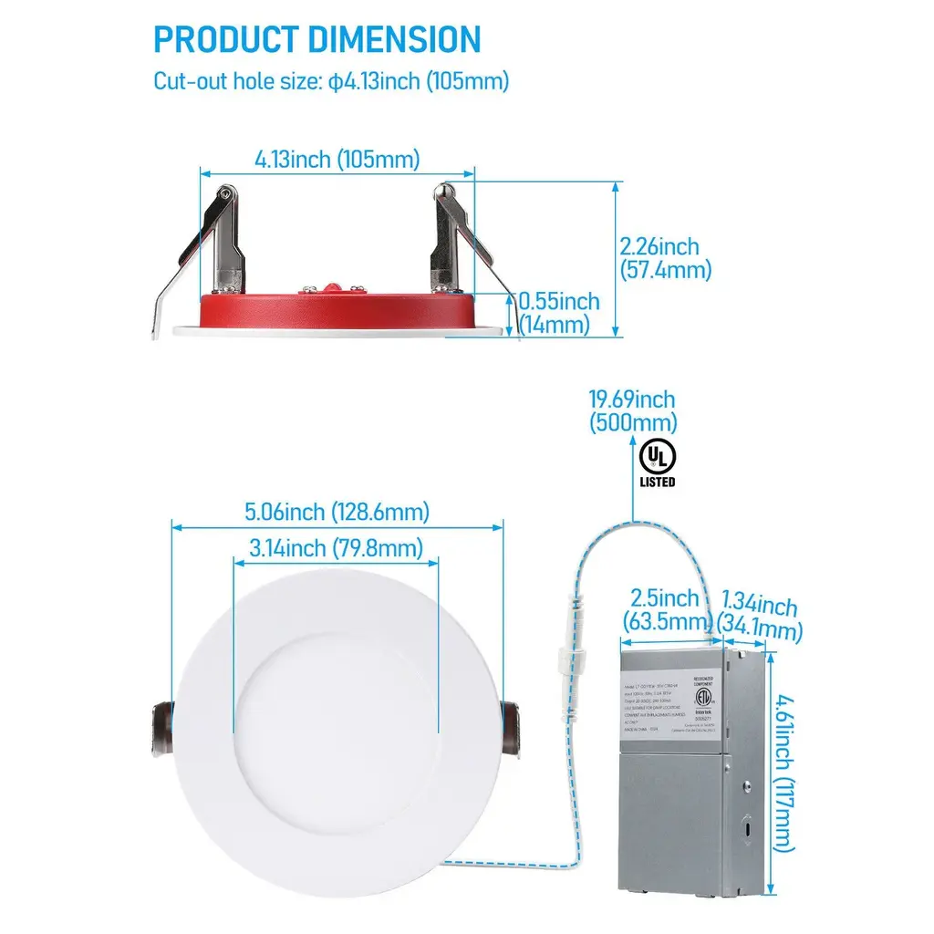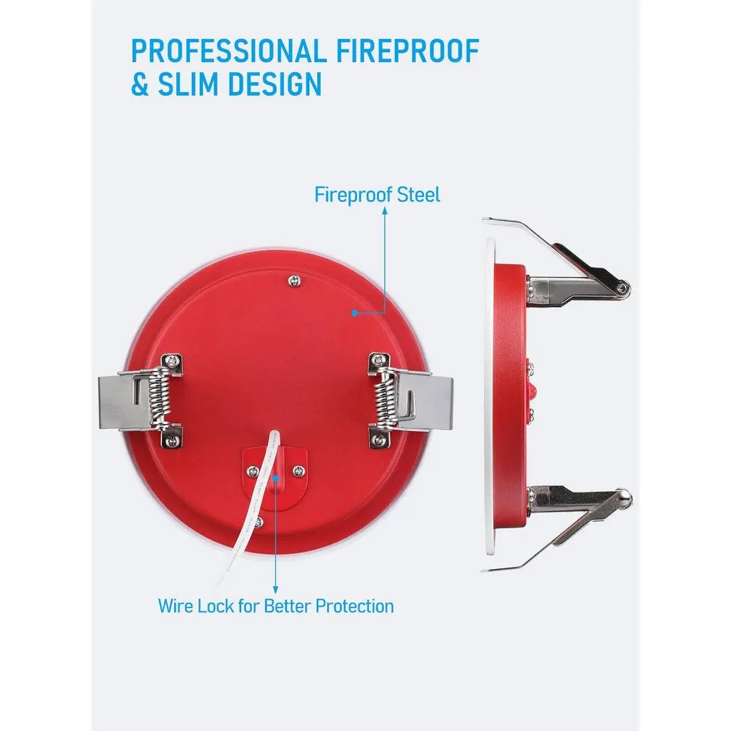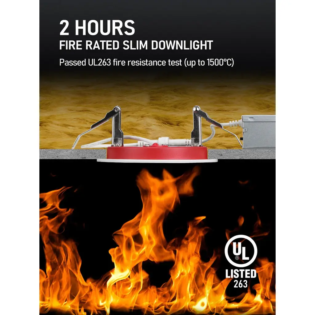 UL263 2-hour Fire RatingThe sleek recessed lighting has been approved to endure fires for a maximum of 2 hours, even at temperatures reaching 1850°F (1010°C). It complies with ASTME119 and CAN ULC S101 regulations, ensuring safety in locations such as hospitals, schools, and hotels.Insulation Contact Rated and Sealed Against Air LeakageWith a focus on safety and energy efficiency, this LED light is designed to ensure safe contact with insulation materials and prevent air leakage, minimizing the risk of overheating or fires and providing peace of mind for worry-free use.Slim ProfileFeaturing minimal installation height requirements for ceiling gaps, the ultra-thin recessed lighting conserves space and offers versatility for use in a range of environments, including low profile and shallow ceiling configurations.Adjustable Color TemperatureSelect from a range of color temperatures including 2700K, 3000K, 3500K, 4000K, or 5000K, all with a CRI of 90 to ensure accurate color rendering. These dimmable options are ideal for recessed lighting applications in commercial, hospitality, education, healthcare, office, and industrial environments.Durable and ReliableConstructed with an aluminum ring and mild steel backplate, our fixture is designed to last up to 50,000 hours. It is certified by ETL, FCC, Energy Star, and T24 for quality assurance.SpecificationsWattage: 10W/15WVoltage: 120VLuminous flux: 650lm/1100lmCRI>90Lifespan: 50,000 hrsBeam angle: 110°CCT: 2700K/3000K/3500K/4000K/5000KDimming range: 10%-100%Working temp: 5°F-104°FMaterial: Aluminum