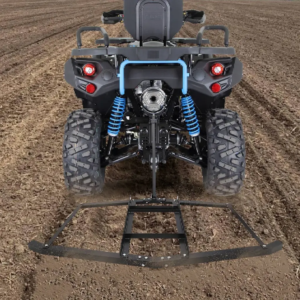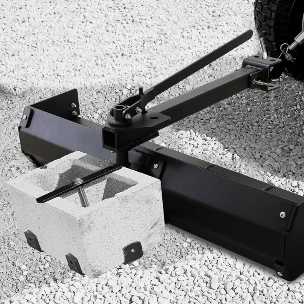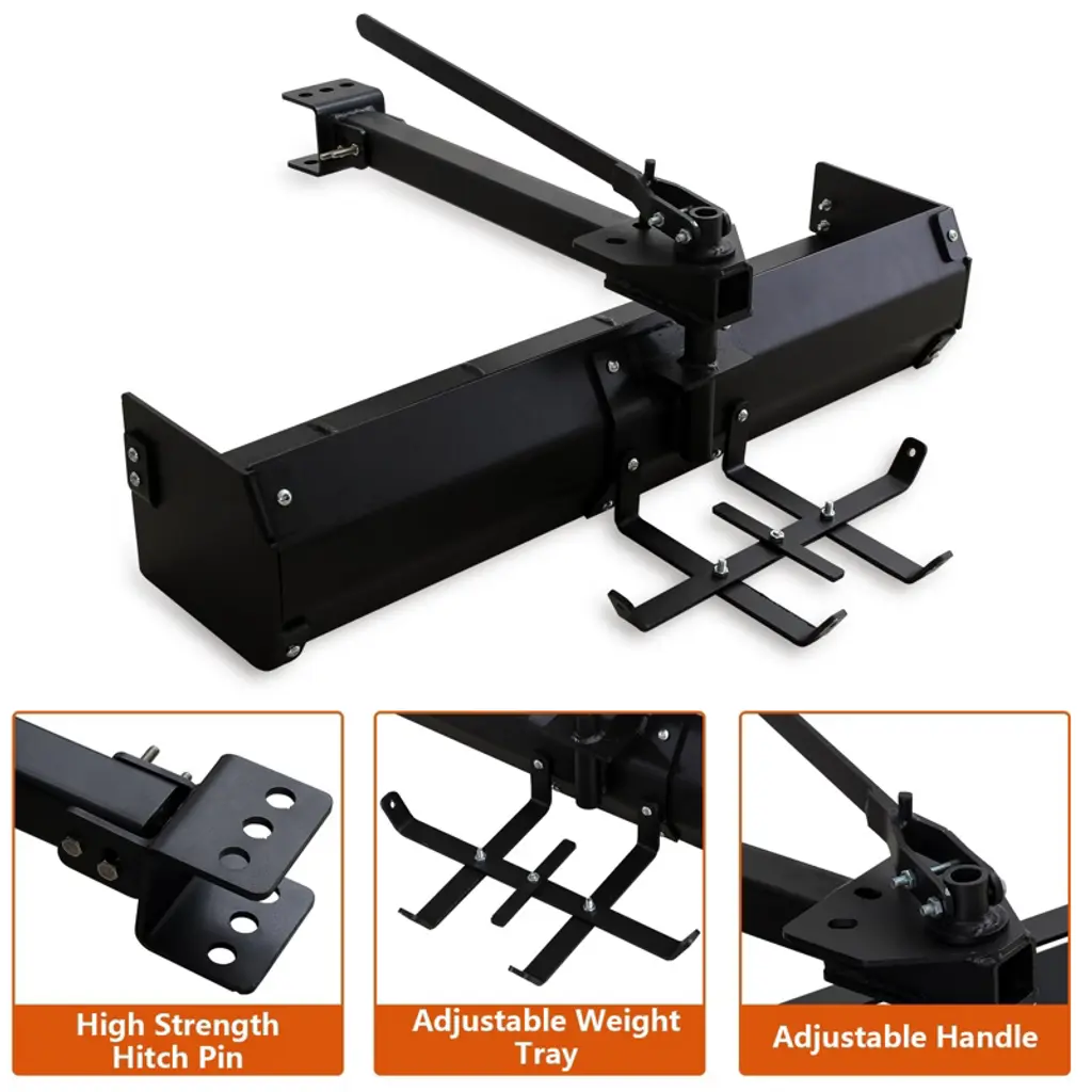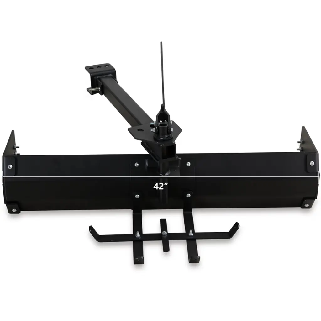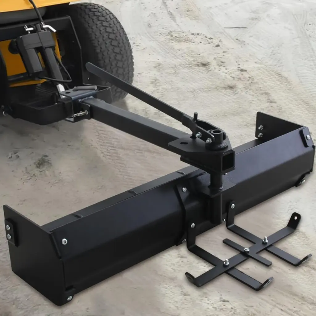 Achieve your dream lawn with the 42" Tow Behind Box Scraper, perfect for creating a beautiful outdoor space.The Scraper Blade can be set to a 30-degree lock in either direction, providing versatility for your landscaping needs.Easily connects to most lawn tractors, ztrs, and ATVs with a universal hitch for seamless attachment.