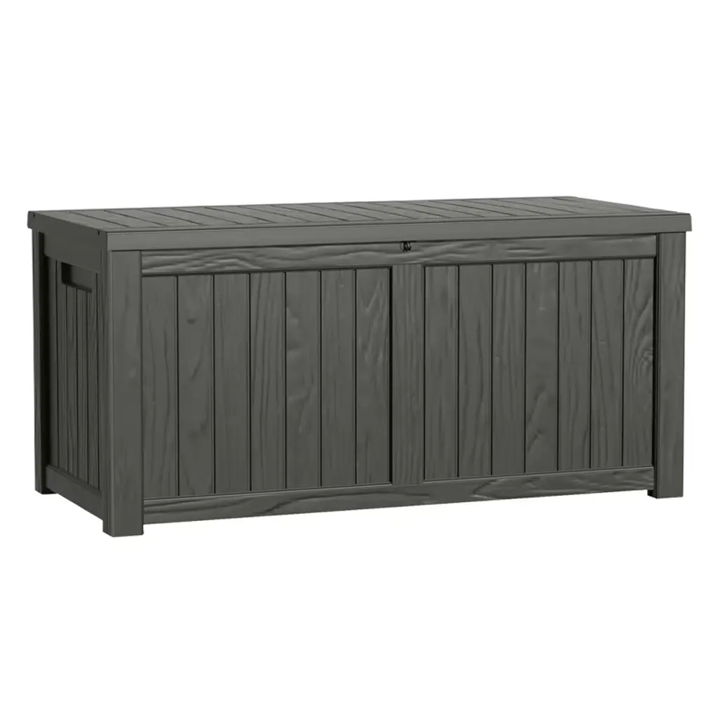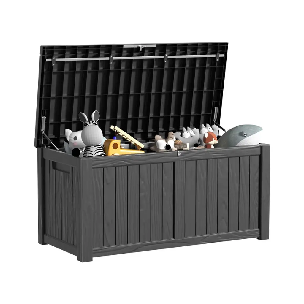 450L/120Gal storage capacity with iron rod & two piston hinges Attractive woodgrain effect with Lockable lid Durable polypropylene resin construction will not rust, dent or peel Strong enough to sit two people on UV protected and weatherproof Steel Supports for Strength KD design,Easy to clean & assemble