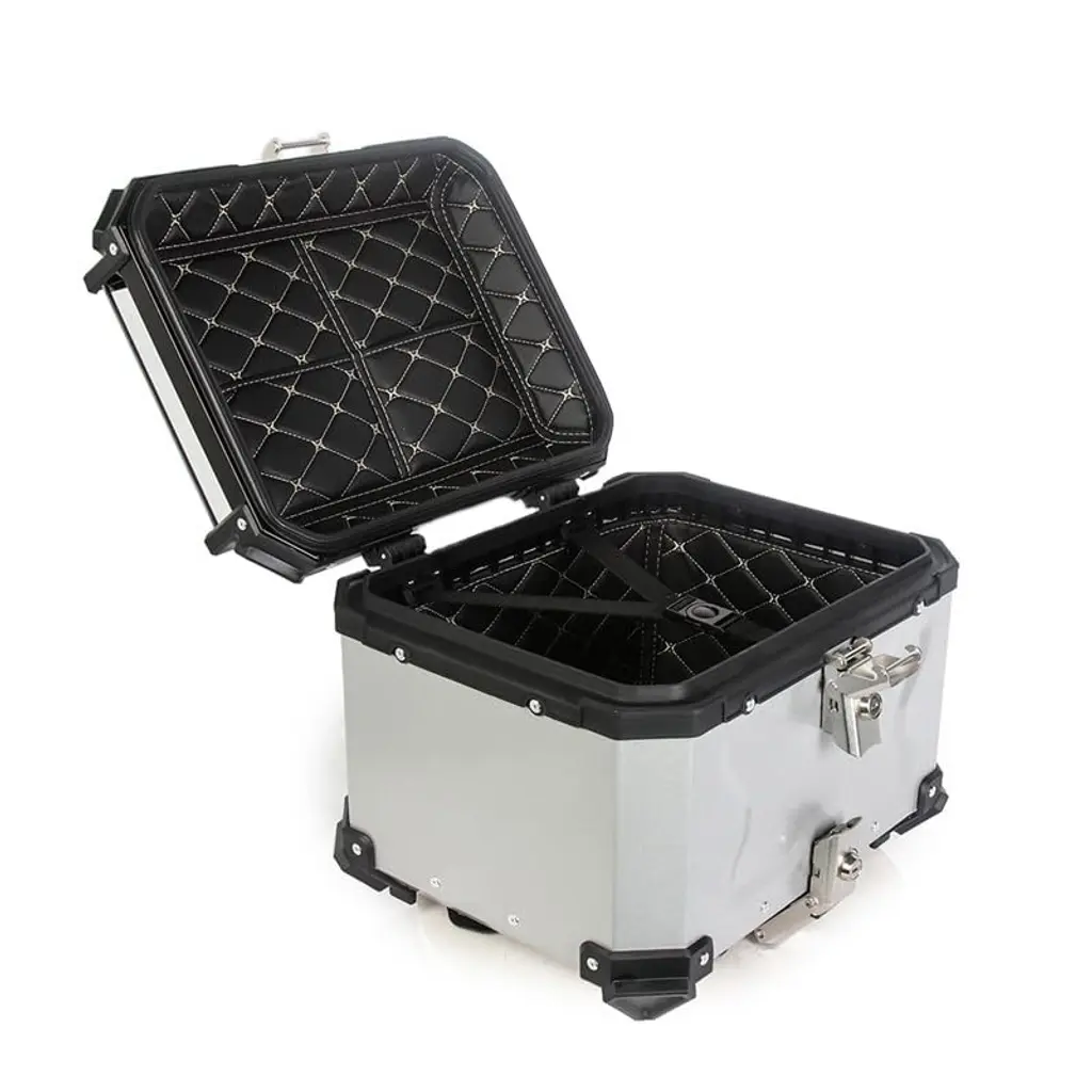 "Motorcycle Top Box ¨C 45L Aluminum Lockable Storage Case (TruAIR Brand, Embossed Silver)"Product Details & Specifications:Premium Aluminum ConstructionMade from high-quality aluminum alloy for durability and lightweight performance (7,051g)Embossed silver finish with reflective strips for enhanced visibility and styleSpacious & Organized Storage45L capacity (46L x 40W x 38H cm) ¨C fits helmets, rain gear, gloves, and essentialsRemovable shock-absorbing lining for easy cleaningWeatherproof & SecureWaterproof and dustproof design protects contents in all conditionsLockable system prevents theft and keeps belongings safeSafety & ProtectionAnti-drop corner covers prevent damage during useReflective strips improve nighttime visibilityEasy Installation & UseQuick-release mounting system ¨C no drilling requiredUniversal fit for most motorcycle tailgatesBrand: TruAIRMaterial: AluminumColor: Embossed SilverWeight: 7,051 gSpecial Features: Waterproof, Lockable, Reflective Strips