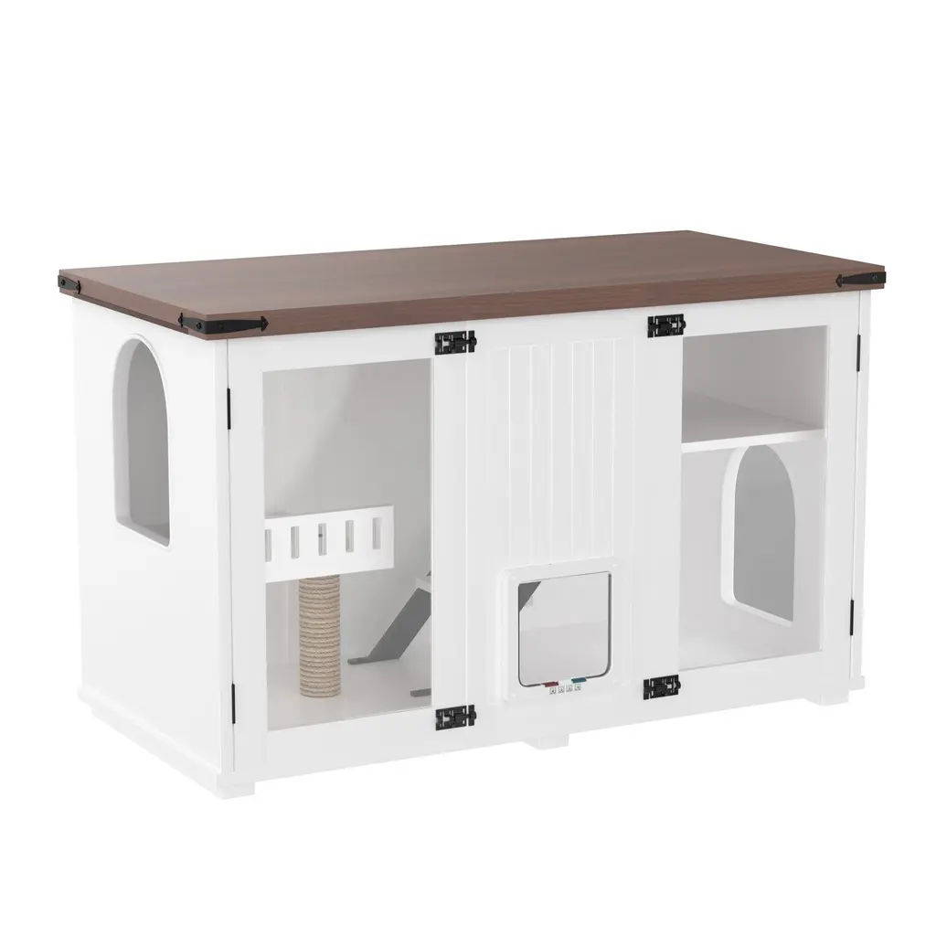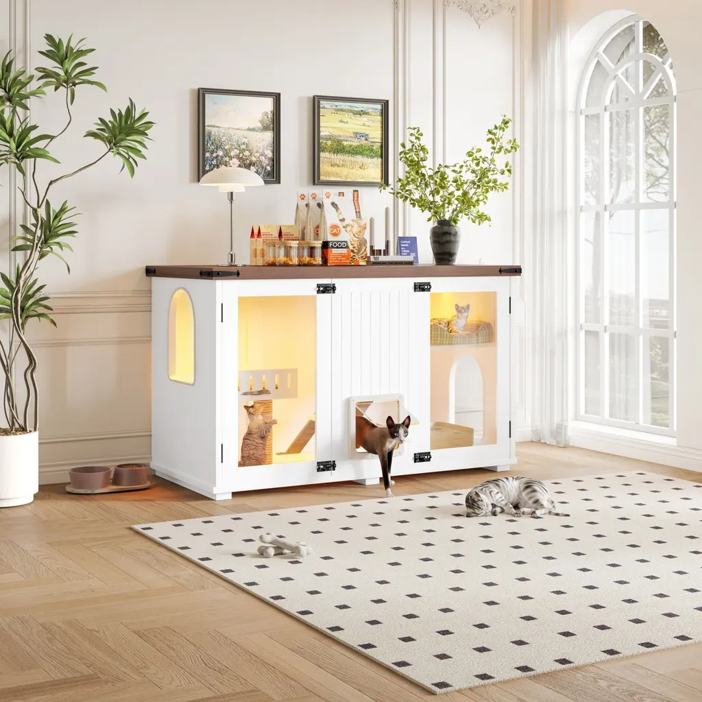 Upgrade your home with this multifunctional 47.25" large cat litter box enclosure that doubles as stylish furniture. Designed for both function and aesthetics, it keeps litter boxes hidden while adding a modern touch to your living room. The spacious structure includes areas for litter, rest, and play—perfect for 1-2 cats. Built-in LED lighting, smart lockable doors, and acrylic panels offer convenience and visibility. The cabinet also features a scratch post, stairs, and dual platforms, giving your pet a comfortable and engaging environment. Made from durable engineered wood and acrylic, this white cat house is easy to clean and built to last.Features:Specifications: