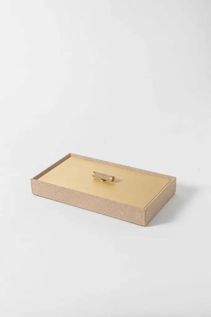 Elegant and versatile. Iside boxes combine luxurious hues and textures to elevate the aesthetic of both a modern and a classic interior. A wooden structure covered with the softest calfskin leather and beautifully contrasted by a satin brass lid. Finished with a cylindrical handle. Imprinted by Maker