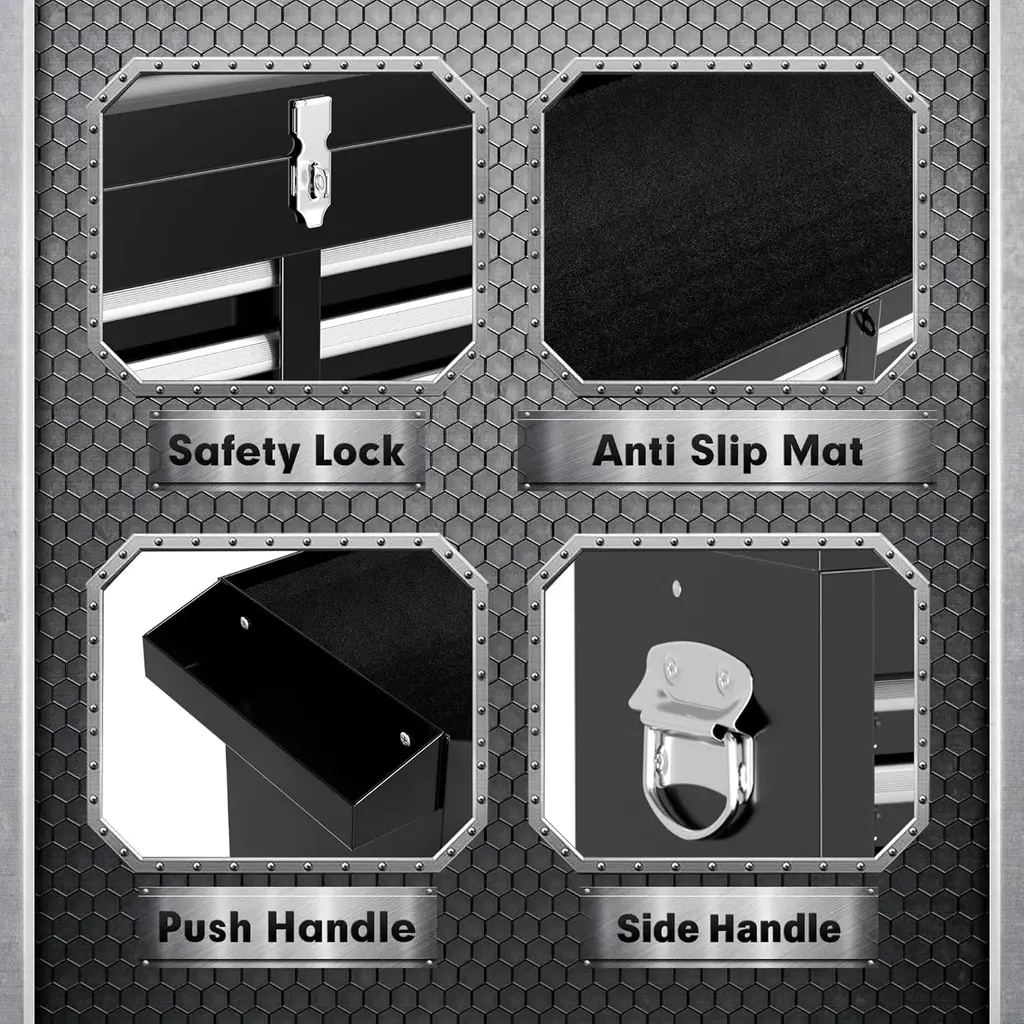 The rolling tool chest with drawers is secure, the main body is made of high-strength cold-rolled steel plate with high-quality materials and solid technology. The surface of the tool chest is coated with anti-corrosion and anti-rust coating, which makes it more durable and suitable for indoor and outdoor scenes. In addition,there are EVA liners inside every drawer to prevent scratches on the drawers and tools. The tool chests with 4 universal wheels make it easy to move around, in addition 2 of the wheels have a locking function to keep it in a fixed position while ensuring safety. The wheels are made of rubber and plastic composite materials. It has excellent wear resistance. With the help of the universal wheel, it provides great convenience for the tool chest to move, and adapt to a variety of working environments.Features: Package Includes: