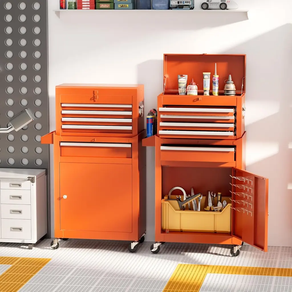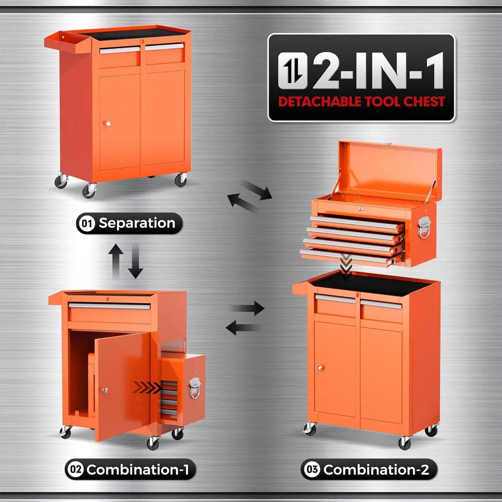 5 Drawer 2 In 1 Rolling Tool Chest Cabinet Garage Storage Toolbox With Detachable Top Tool Box And Universal Lockable Wheels - Orange