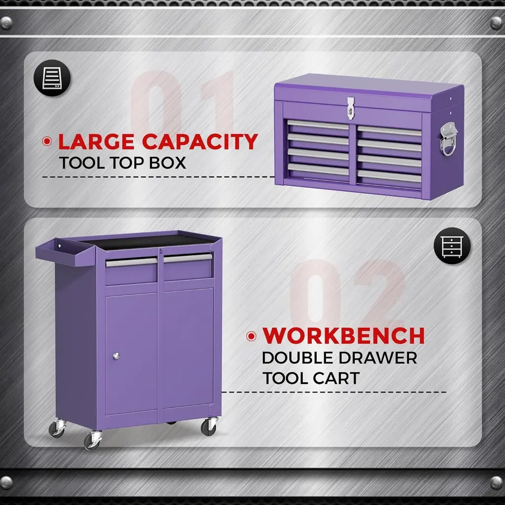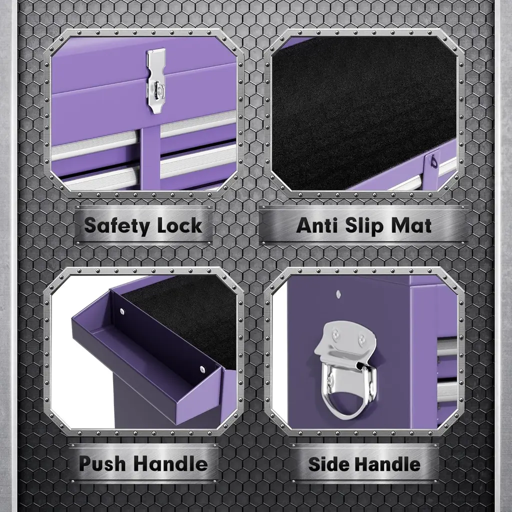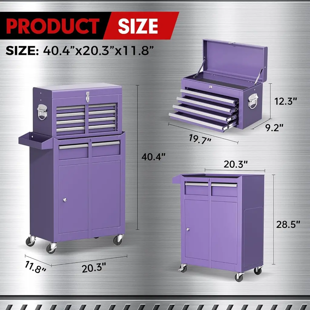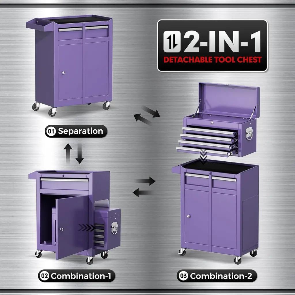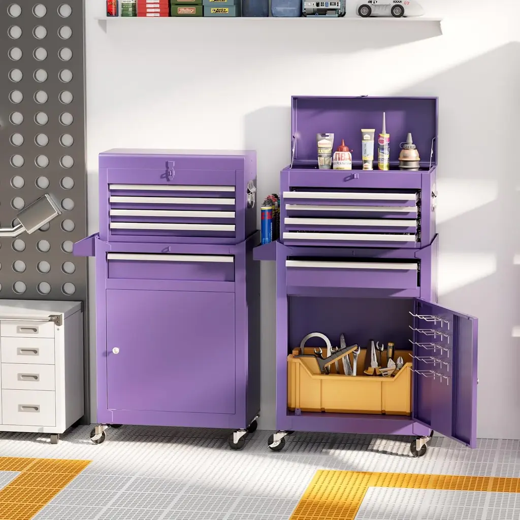 5 Drawer 2 In 1 Rolling Tool Chest Cabinet Garage Storage Toolbox With Detachable Top Tool Box And Universal Lockable Wheels - Purple